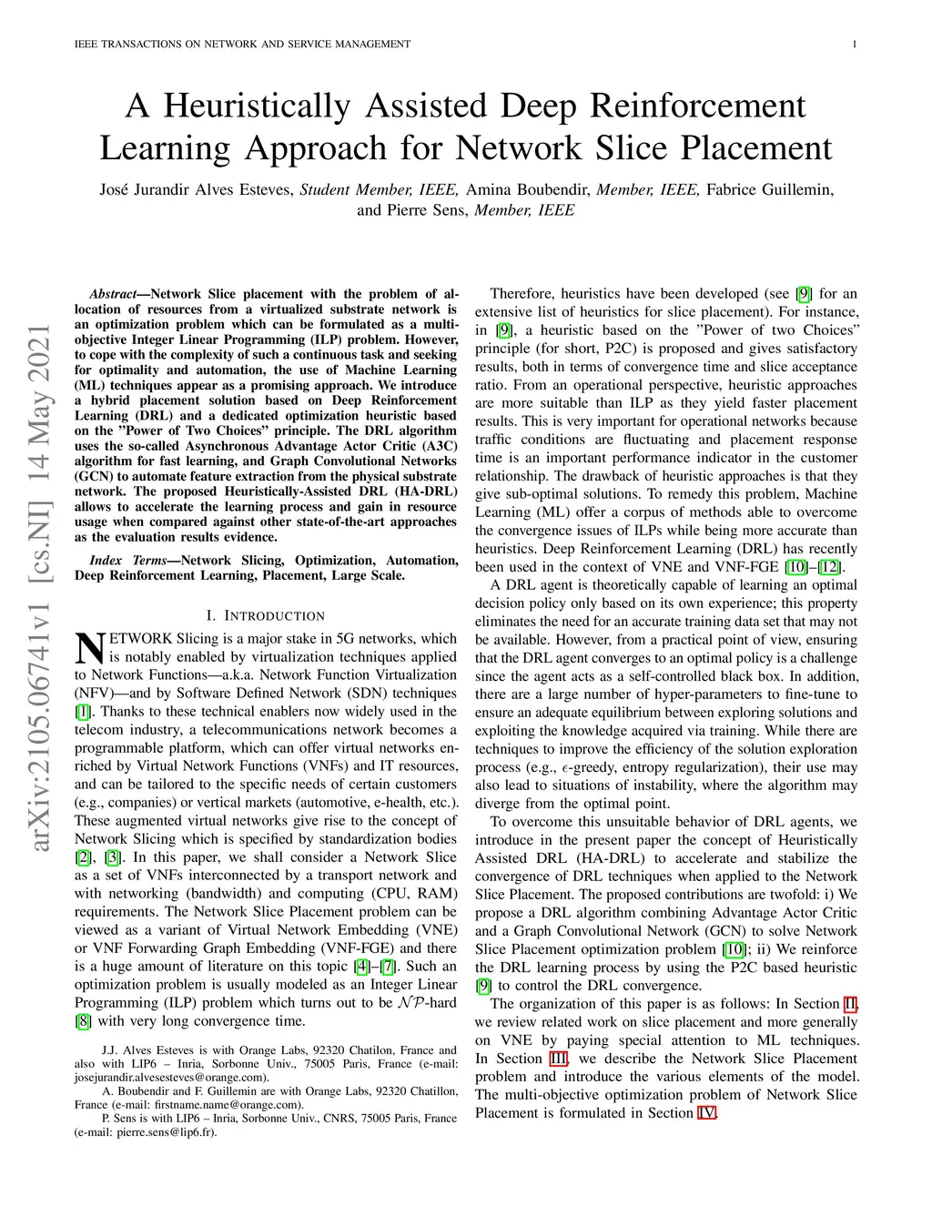 Network Slice placement with the problem of allocation of resources from a virtualized substrate network is an optimization problem which can be formulated as a multiobjective Integer Linear Programming (ILP) problem. However, to cope with the complexity of such a continuous task and seeking for optimality and automation, the use of Machine Learning (ML) techniques appear as a promising approach. We introduce a hybrid placement solution based on Deep Reinforcement Learning (DRL) and a dedicated optimization heuristic based on the Power of Two Choices principle. The DRL algorithm uses the so-called Asynchronous Advantage Actor Critic (A3C) algorithm for fast learning, and Graph Convolutional Networks (GCN) to automate feature extraction from the physical substrate network. The proposed Heuristically-Assisted DRL (HA-DRL) allows to accelerate the learning process and gain in resource usage when compared against other state-of-the-art approaches as the evaluation results evidence.