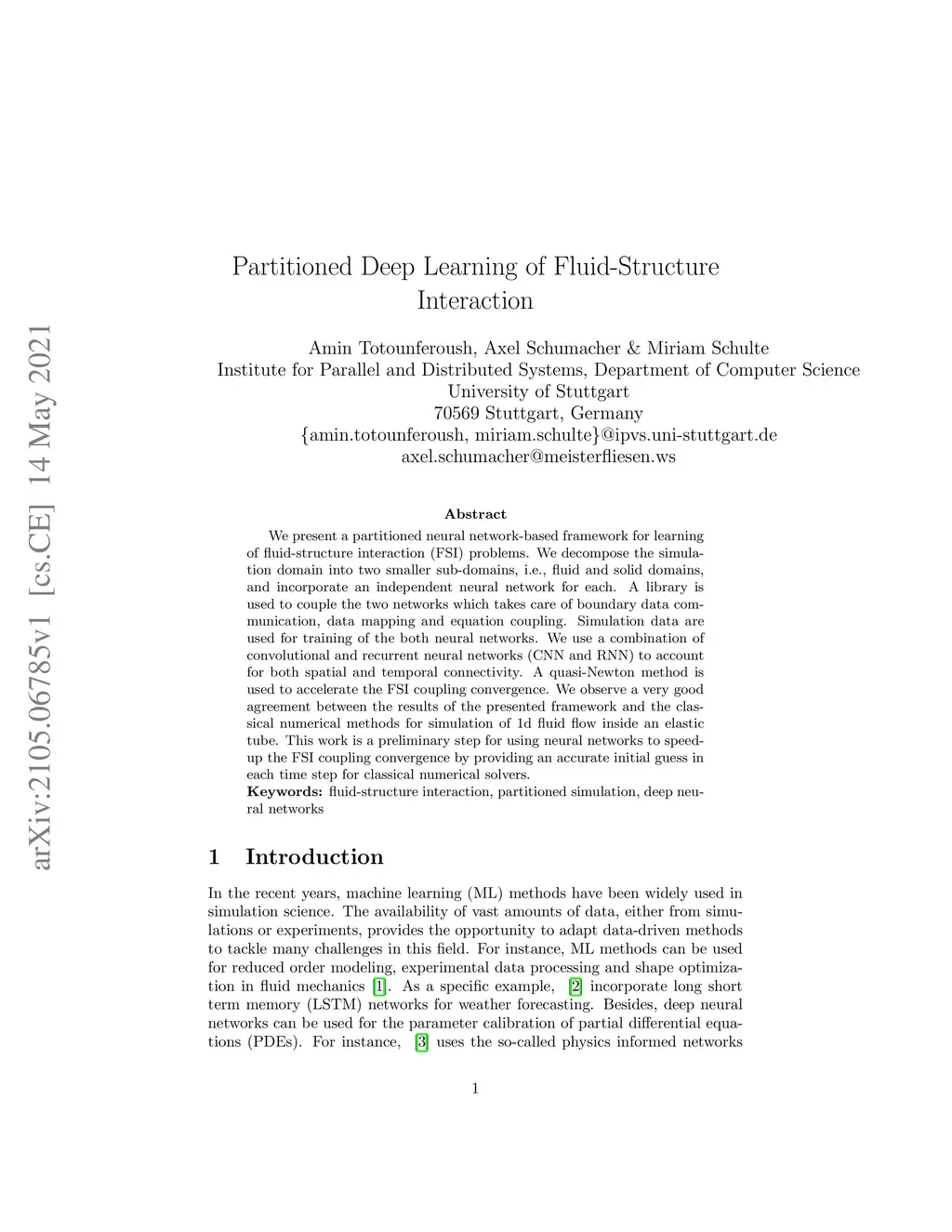 We present a partitioned neural network-based framework for learning of fluid-structure interaction (FSI) problems. We decompose the simulation domain into two smaller sub-domains, i.e., fluid and solid domains, and incorporate an independent neural network for each. A library is used to couple the two networks which takes care of boundary data communication, data mapping and equation coupling. Simulation data are used for training of the both neural networks. We use a combination of convolutional and recurrent neural networks (CNN and RNN) to account for both spatial and temporal connectivity. A quasi-Newton method is used to accelerate the FSI coupling convergence. We observe a very good agreement between the results of the presented framework and the classical numerical methods for simulation of 1d fluid flow inside an elastic tube. This work is a preliminary step for using neural networks to speed-up the FSI coupling convergence by providing an accurate initial guess in each time step for classical numerical solvers