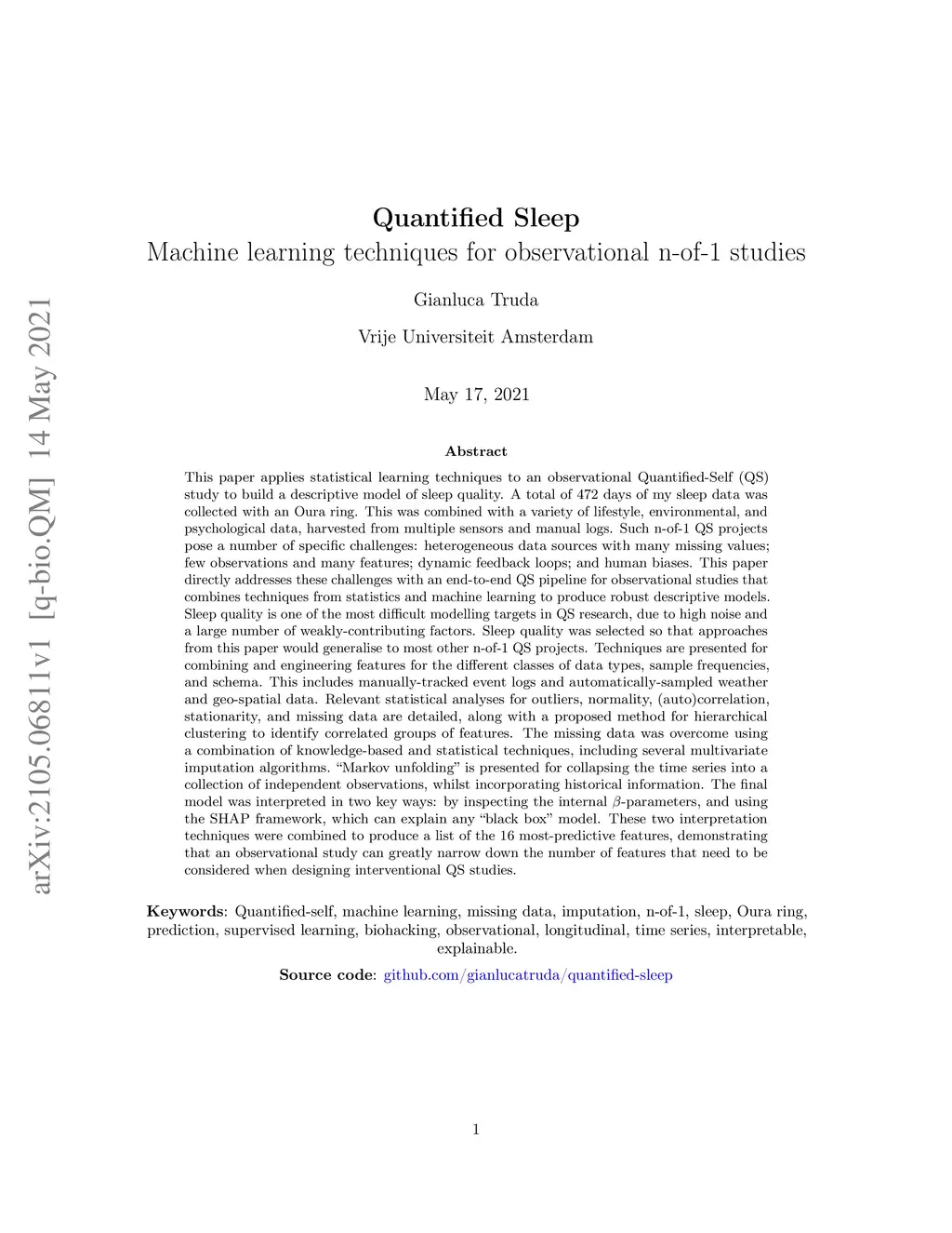 This paper applies statistical learning techniques to an observational Quantified-Self (QS) study to build a descriptive model of sleep quality. A total of 472 days of my sleep data was collected with an Oura ring and combined with lifestyle, environmental, and psychological data. Such n-of-1 QS projects pose a number of challenges: heterogeneous data sources; missing values; high dimensionality; dynamic feedback loops; human biases. This paper directly addresses these challenges with an end-to-end QS pipeline that produces robust descriptive models. Sleep quality is one of the most difficult modelling targets in QS research, due to high noise and a large number of weakly-contributing factors. Sleep quality was selected so that approaches from this paper would generalise to most other n-of-1 QS projects. Techniques are presented for combining and engineering features for the different classes of data types, sample frequencies, and schema - including event logs, weather, and geo-spatial data. Statistical analyses for outliers, normality, (auto)correlation, stationarity, and missing data are detailed, along with a proposed method for hierarchical clustering to identify correlated groups of features. The missing data was overcome using a combination of knowledge-based and statistical techniques, including several multivariate imputation algorithms. "Markov unfolding" is presented for collapsing the time series into a collection of independent observations, whilst incorporating historical information. The final model was interpreted in two ways: by inspecting the internal -parameters, and using the SHAP framework. These two interpretation techniques were combined to produce a list of the 16 most-predictive features, demonstrating that an observational study can greatly narrow down the number of features that need to be considered when designing interventional QS studies.