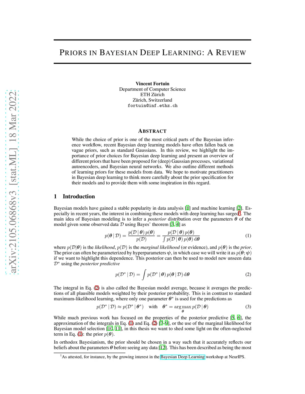 While the choice of prior is one of the most critical parts of the Bayesian inference workflow, recent Bayesian deep learning models have often fallen back on vague priors, such as standard Gaussians. In this review, we highlight the importance of prior choices for Bayesian deep learning and present an overview of different priors that have been proposed for (deep) Gaussian processes, variational autoencoders, and Bayesian neural networks. We also outline different methods of learning priors for these models from data. We hope to motivate practitioners in Bayesian deep learning to think more carefully about the prior specification for their models and to provide them with some inspiration in this regard.