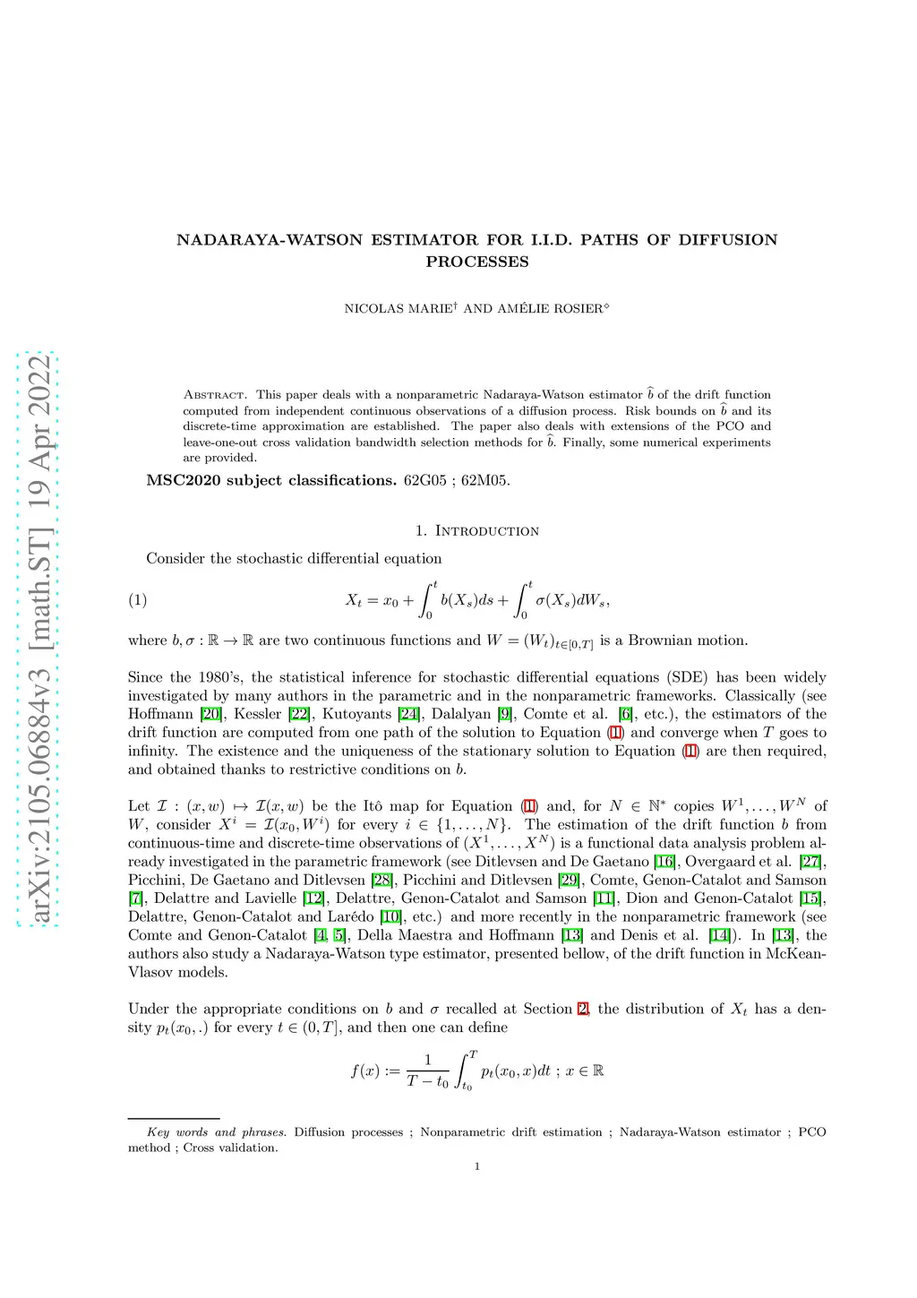 Nadaraya-Watson Estimator for I.I.D. Paths of Diffusion Processes