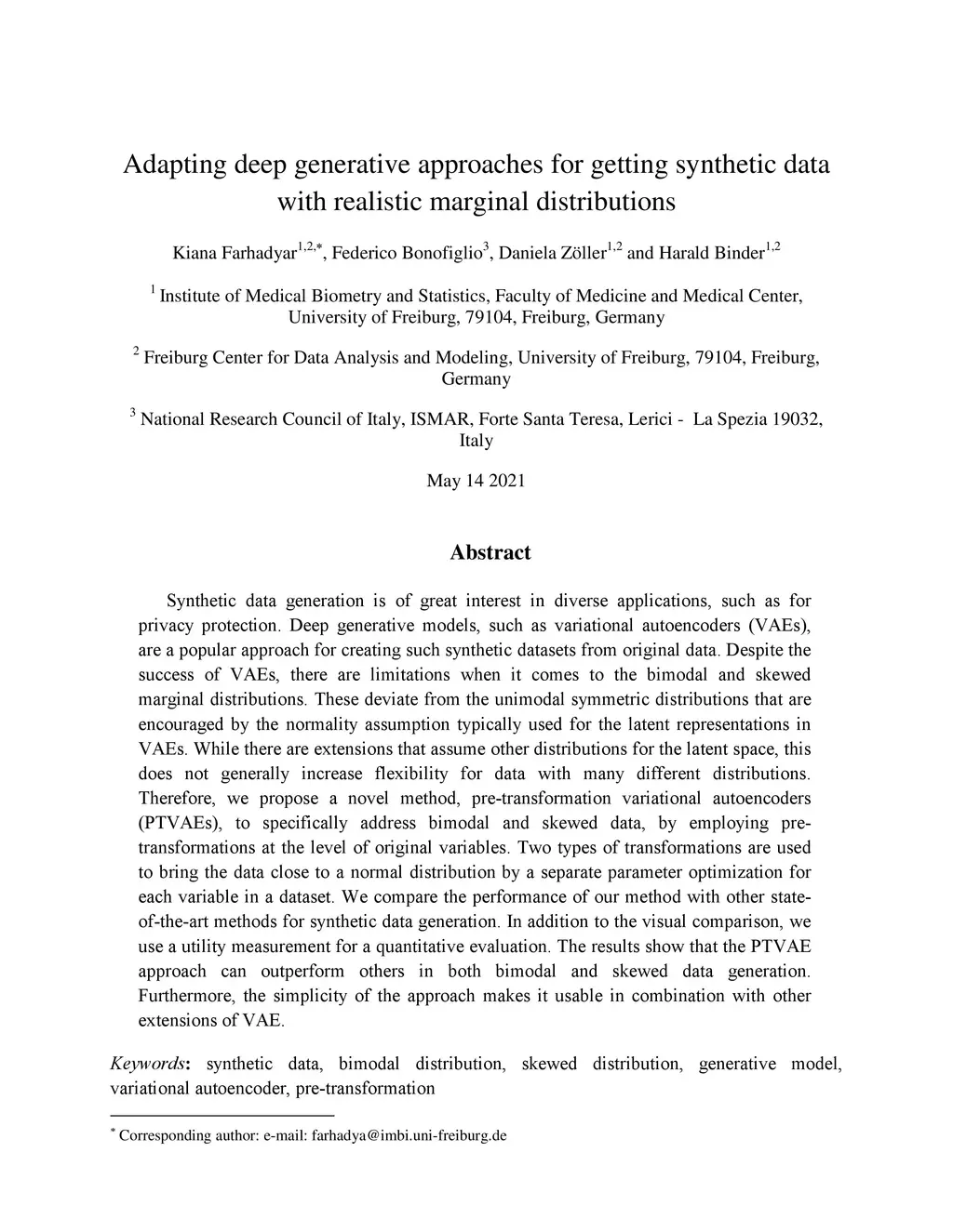 Synthetic data generation is of great interest in diverse applications, such as for privacy protection. Deep generative models, such as variational autoencoders (VAEs), are a popular approach for creating such synthetic datasets from original data. Despite the success of VAEs, there are limitations when it comes to the bimodal and skewed marginal distributions. These deviate from the unimodal symmetric distributions that are encouraged by the normality assumption typically used for the latent representations in VAEs. While there are extensions that assume other distributions for the latent space, this does not generally increase flexibility for data with many different distributions. Therefore, we propose a novel method, pre-transformation variational autoencoders (PTVAEs), to specifically address bimodal and skewed data, by employing pre-transformations at the level of original variables. Two types of transformations are used to bring the data close to a normal distribution by a separate parameter optimization for each variable in a dataset. We compare the performance of our method with other state-of-the-art methods for synthetic data generation. In addition to the visual comparison, we use a utility measurement for a quantitative evaluation. The results show that the PTVAE approach can outperform others in both bimodal and skewed data generation. Furthermore, the simplicity of the approach makes it usable in combination with other extensions of VAE.