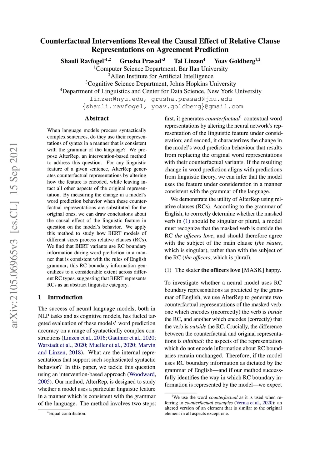 When language models process syntactically complex sentences, do they use their representations of syntax in a manner that is consistent with the grammar of the language? We propose AlterRep, an intervention-based method to address this question. For any linguistic feature of a given sentence, AlterRep generates counterfactual representations by altering how the feature is encoded, while leaving intact all other aspects of the original representation. By measuring the change in a model's word prediction behavior when these counterfactual representations are substituted for the original ones, we can draw conclusions about the causal effect of the linguistic feature in question on the model's behavior. We apply this method to study how BERT models of different sizes process relative clauses (RCs). We find that BERT variants use RC boundary information during word prediction in a manner that is consistent with the rules of English grammar; this RC boundary information generalizes to a considerable extent across different RC types, suggesting that BERT represents RCs as an abstract linguistic category.