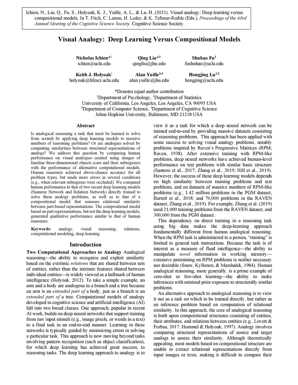 Is analogical reasoning a task that must be learned to solve from scratch by applying deep learning models to massive numbers of reasoning problems? Or are analogies solved by computing similarities between structured representations of analogs? We address this question by comparing human performance on visual analogies created using images of familiar three-dimensional objects (cars and their subregions) with the performance of alternative computational models. Human reasoners achieved above-chance accuracy for all problem types, but made more errors in several conditions (e.g., when relevant subregions were occluded). We compared human performance to that of two recent deep learning models (Siamese Network and Relation Network) directly trained to solve these analogy problems, as well as to that of a compositional model that assesses relational similarity between part-based representations. The compositional model based on part representations, but not the deep learning models, generated qualitative performance similar to that of human reasoners.