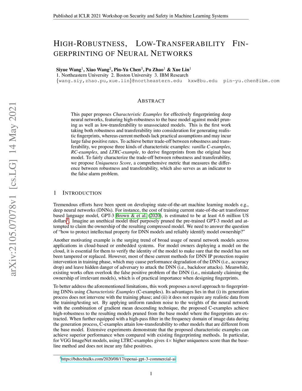 This paper proposes Characteristic Examples for effectively fingerprinting deep neural networks, featuring high-robustness to the base model against model pruning as well as low-transferability to unassociated models. This is the first work taking both robustness and transferability into consideration for generating realistic fingerprints, whereas current methods lack practical assumptions and may incur large false positive rates. To achieve better trade-off between robustness and transferability, we propose three kinds of characteristic examples: vanilla C-examples, RC-examples, and LTRC-example, to derive fingerprints from the original base model. To fairly characterize the trade-off between robustness and transferability, we propose Uniqueness Score, a comprehensive metric that measures the difference between robustness and transferability, which also serves as an indicator to the false alarm problem.