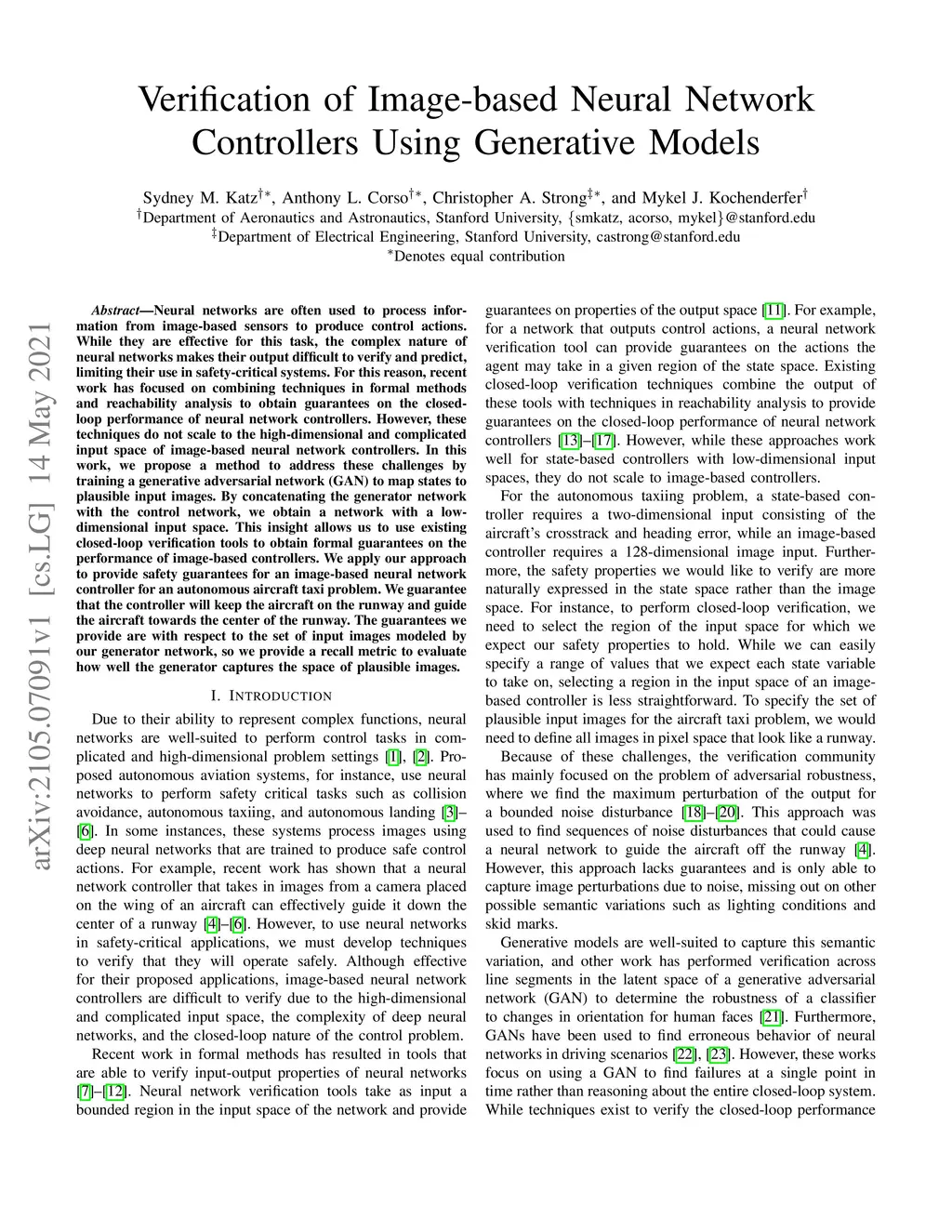 Neural networks are often used to process information from image-based sensors to produce control actions. While they are effective for this task, the complex nature of neural networks makes their output difficult to verify and predict, limiting their use in safety-critical systems. For this reason, recent work has focused on combining techniques in formal methods and reachability analysis to obtain guarantees on the closed-loop performance of neural network controllers. However, these techniques do not scale to the high-dimensional and complicated input space of image-based neural network controllers. In this work, we propose a method to address these challenges by training a generative adversarial network (GAN) to map states to plausible input images. By concatenating the generator network with the control network, we obtain a network with a low-dimensional input space. This insight allows us to use existing closed-loop verification tools to obtain formal guarantees on the performance of image-based controllers. We apply our approach to provide safety guarantees for an image-based neural network controller for an autonomous aircraft taxi problem. We guarantee that the controller will keep the aircraft on the runway and guide the aircraft towards the center of the runway. The guarantees we provide are with respect to the set of input images modeled by our generator network, so we provide a recall metric to evaluate how well the generator captures the space of plausible images.
