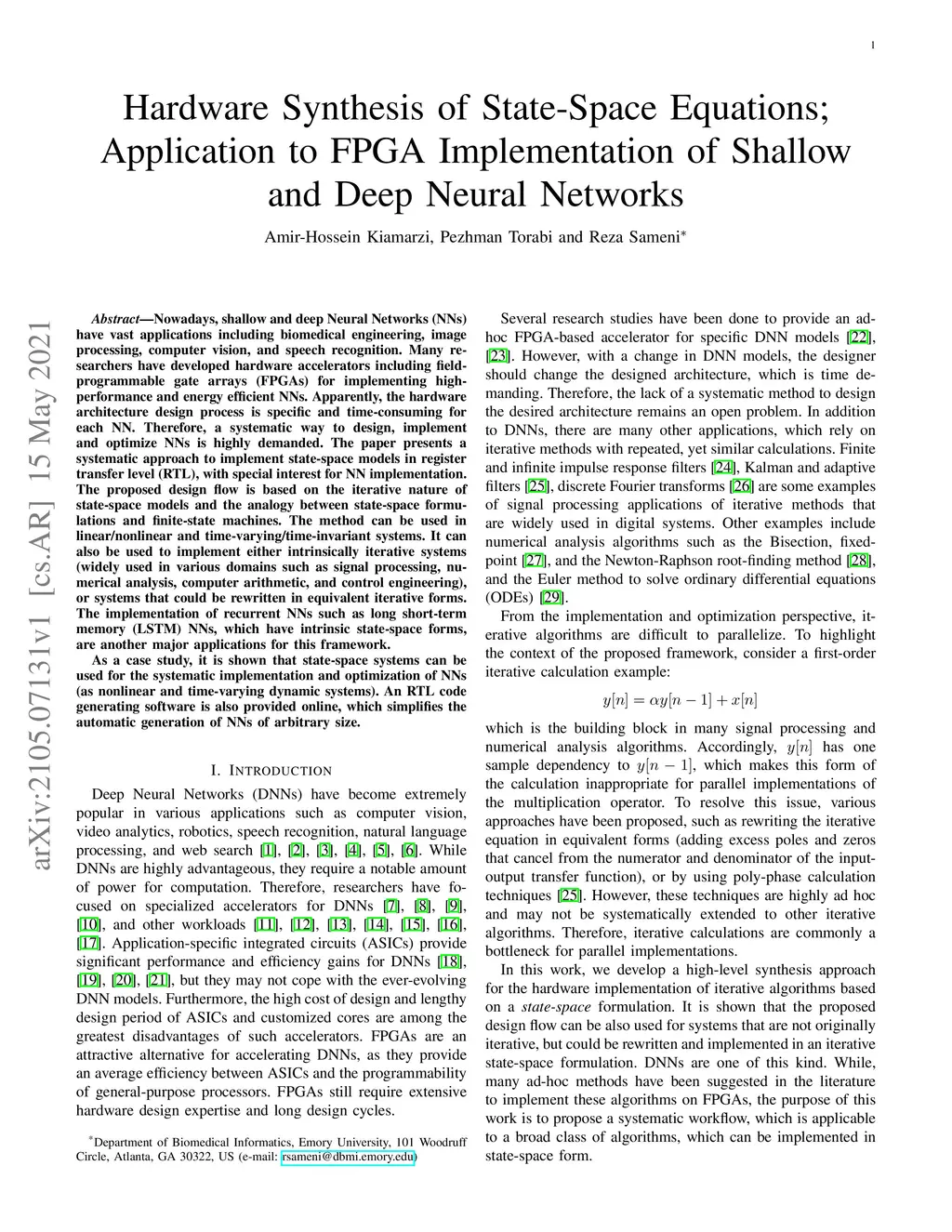 Nowadays, shallow and deep Neural Networks (NNs) have vast applications including biomedical engineering, image processing, computer vision, and speech recognition. Many researchers have developed hardware accelerators including field-programmable gate arrays (FPGAs) for implementing high-performance and energy efficient NNs. Apparently, the hardware architecture design process is specific and time-consuming for each NN. Therefore, a systematic way to design, implement and optimize NNs is highly demanded. The paper presents a systematic approach to implement state-space models in register transfer level (RTL), with special interest for NN implementation. The proposed design flow is based on the iterative nature of state-space models and the analogy between state-space formulations and finite-state machines. The method can be used in linear/nonlinear and time-varying/time-invariant systems. It can also be used to implement either intrinsically iterative systems (widely used in various domains such as signal processing, numerical analysis, computer arithmetic, and control engineering), or systems that could be rewritten in equivalent iterative forms. The implementation of recurrent NNs such as long short-term memory (LSTM) NNs, which have intrinsic state-space forms, are another major applications for this framework. As a case study, it is shown that state-space systems can be used for the systematic implementation and optimization of NNs (as nonlinear and time-varying dynamic systems). An RTL code generating software is also provided online, which simplifies the automatic generation of NNs of arbitrary size.