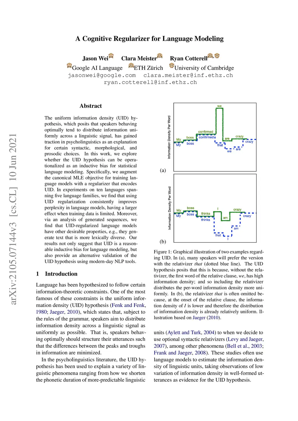The uniform information density (UID) hypothesis, which posits that speakers behaving optimally tend to distribute information uniformly across a linguistic signal, has gained traction in psycholinguistics as an explanation for certain syntactic, morphological, and prosodic choices. In this work, we explore whether the UID hypothesis can be operationalized as an inductive bias for statistical language modeling. Specifically, we augment the canonical MLE objective for training language models with a regularizer that encodes UID. In experiments on ten languages spanning five language families, we find that using UID regularization consistently improves perplexity in language models, having a larger effect when training data is limited. Moreover, via an analysis of generated sequences, we find that UID-regularized language models have other desirable properties, e.g., they generate text that is more lexically diverse. Our results not only suggest that UID is a reasonable inductive bias for language modeling, but also provide an alternative validation of the UID hypothesis using modern-day NLP tools.