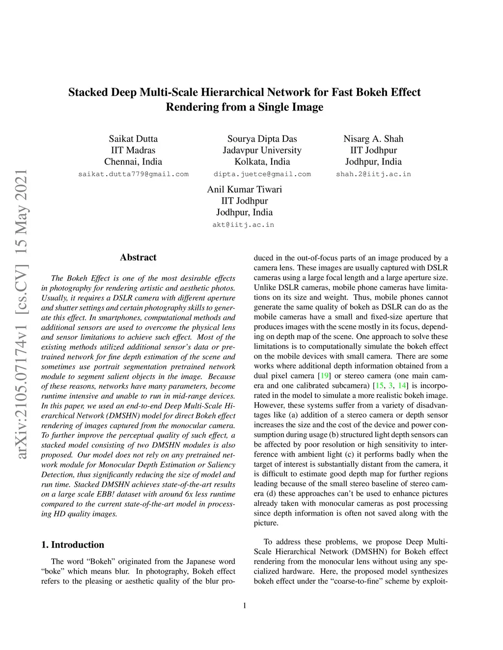 The Bokeh Effect is one of the most desirable effects in photography for rendering artistic and aesthetic photos. Usually, it requires a DSLR camera with different aperture and shutter settings and certain photography skills to generate this effect. In smartphones, computational methods and additional sensors are used to overcome the physical lens and sensor limitations to achieve such effect. Most of the existing methods utilized additional sensor's data or pretrained network for fine depth estimation of the scene and sometimes use portrait segmentation pretrained network module to segment salient objects in the image. Because of these reasons, networks have many parameters, become runtime intensive and unable to run in mid-range devices. In this paper, we used an end-to-end Deep Multi-Scale Hierarchical Network (DMSHN) model for direct Bokeh effect rendering of images captured from the monocular camera. To further improve the perceptual quality of such effect, a stacked model consisting of two DMSHN modules is also proposed. Our model does not rely on any pretrained network module for Monocular Depth Estimation or Saliency Detection, thus significantly reducing the size of model and run time. Stacked DMSHN achieves state-of-the-art results on a large scale EBB! dataset with around 6x less runtime compared to the current state-of-the-art model in processing HD quality images.