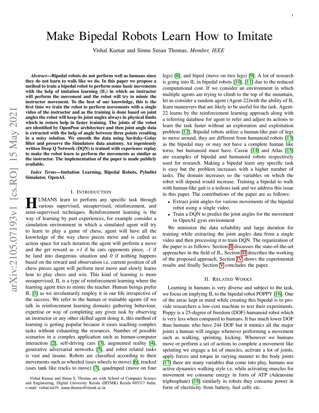 Bipedal robots do not perform well as humans since they do not learn to walk like we do. In this paper we propose a method to train a bipedal robot to perform some basic movements with the help of imitation learning (IL) in which an instructor will perform the movement and the robot will try to mimic the instructor movement. To the best of our knowledge, this is the first time we train the robot to perform movements with a single video of the instructor and as the training is done based on joint angles the robot will keep its joint angles always in physical limits which in return help in faster training. The joints of the robot are identified by OpenPose architecture and then joint angle data is extracted with the help of angle between three points resulting in a noisy solution. We smooth the data using Savitzky-Golay filter and preserve the Simulatore data anatomy. An ingeniously written Deep Q Network (DQN) is trained with experience replay to make the robot learn to perform the movements as similar as the instructor. The implementation of the paper is made publicly available.