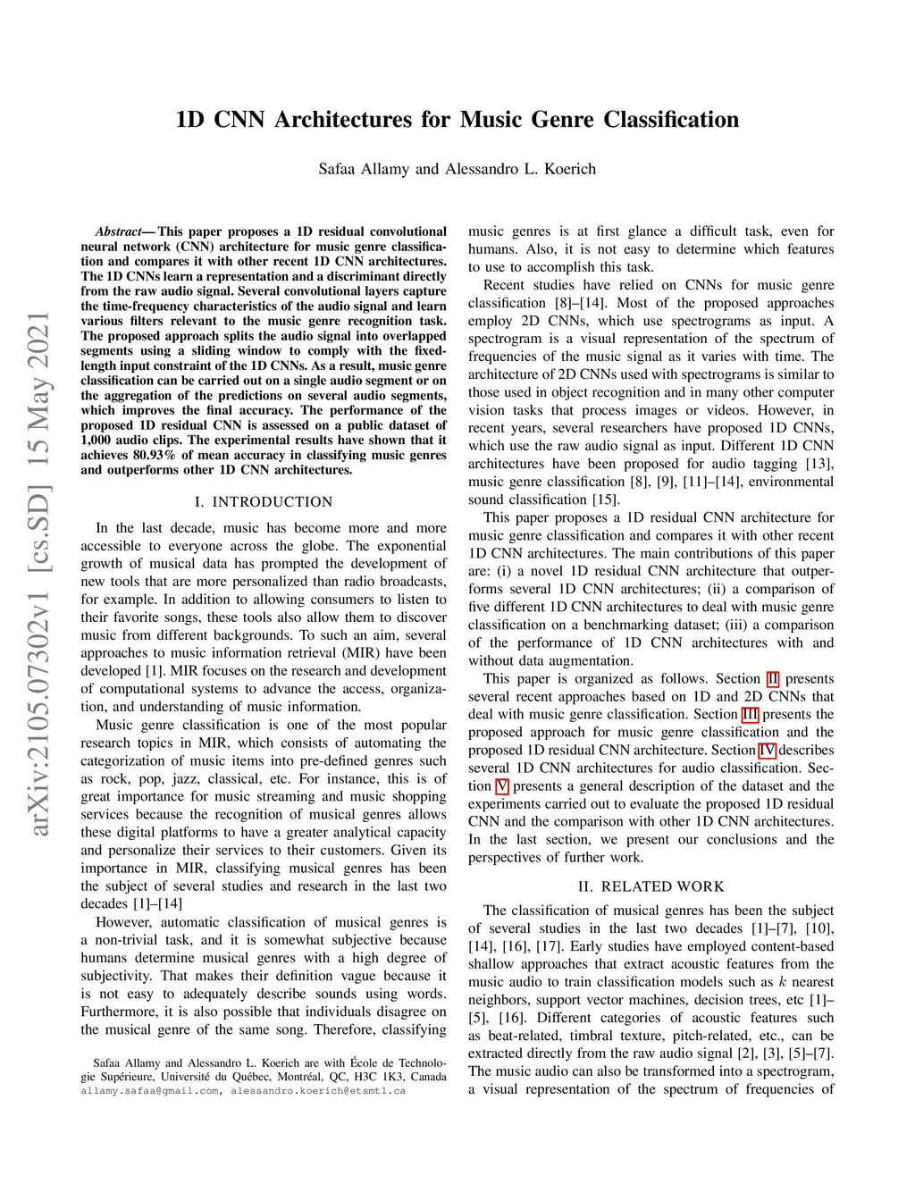 1D CNN Architectures for Music Genre Classification