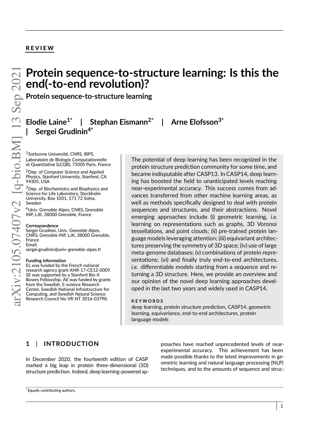The potential of deep learning has been recognized in the protein structure prediction community for some time, and became indisputable after CASP13. In CASP14, deep learning has boosted the field to unanticipated levels reaching near-experimental accuracy. This success comes from advances transferred from other machine learning areas, as well as methods specifically designed to deal with protein sequences and structures, and their abstractions. Novel emerging approaches include (i) geometric learning, i.e. learning on representations such as graphs, 3D Voronoi tessellations, and point clouds; (ii) pre-trained protein language models leveraging attention; (iii) equivariant architectures preserving the symmetry of 3D space; (iv) use of large meta-genome databases; (v) combinations of protein representations; (vi) and finally truly end-to-end architectures, i.e. differentiable models starting from a sequence and returning a 3D structure. Here, we provide an overview and our opinion of the novel deep learning approaches developed in the last two years and widely used in CASP14.