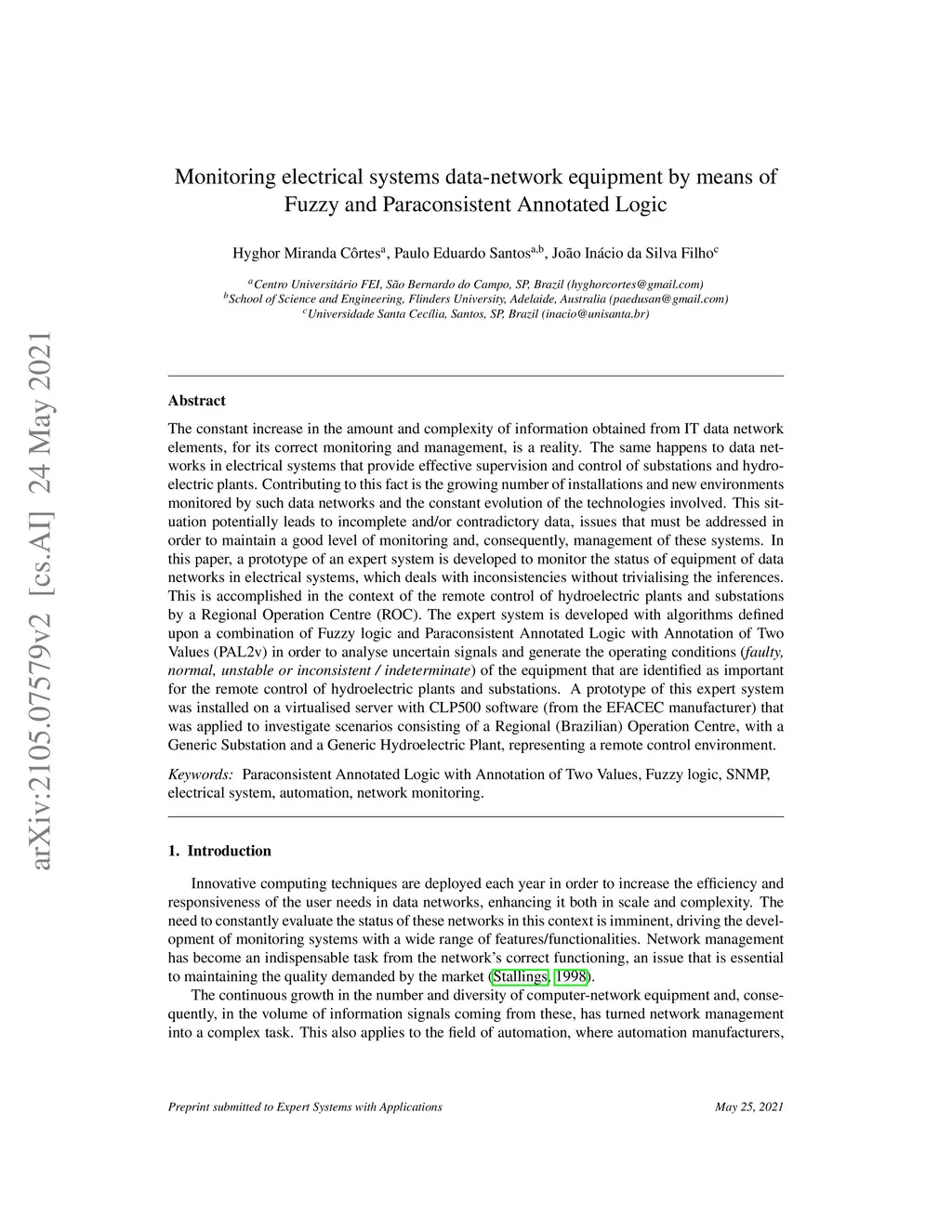 The constant increase in the amount and complexity of information obtained from IT data networkelements, for its correct monitoring and management, is a reality. The same happens to data net-works in electrical systems that provide effective supervision and control of substations and hydro-electric plants. Contributing to this fact is the growing number of installations and new environmentsmonitored by such data networks and the constant evolution of the technologies involved. This sit-uation potentially leads to incomplete and/or contradictory data, issues that must be addressed inorder to maintain a good level of monitoring and, consequently, management of these systems. Inthis paper, a prototype of an expert system is developed to monitor the status of equipment of datanetworks in electrical systems, which deals with inconsistencies without trivialising the inferences.This is accomplished in the context of the remote control of hydroelectric plants and substationsby a Regional Operation Centre (ROC). The expert system is developed with algorithms definedupon a combination of Fuzzy logic and Paraconsistent Annotated Logic with Annotation of TwoValues (PAL2v) in order to analyse uncertain signals and generate the operating conditions (faulty,normal, unstable or inconsistent / indeterminate) of the equipment that are identified as importantfor the remote control of hydroelectric plants and substations. A prototype of this expert systemwas installed on a virtualised server with CLP500 software (from the EFACEC manufacturer) thatwas applied to investigate scenarios consisting of a Regional (Brazilian) Operation Centre, with aGeneric Substation and a Generic Hydroelectric Plant, representing a remote control environment.