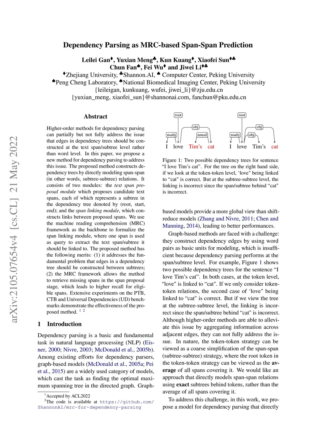 Higher-order methods for dependency parsing can partially but not fully address the issue that edges in dependency trees should be constructed at the text span/subtree level rather than word level. In this paper, we propose a new method for dependency parsing to address this issue. The proposed method constructs dependency trees by directly modeling span-span (in other words, subtree-subtree) relations. It consists of two modules: the {\it text span proposal module} which proposes candidate text spans, each of which represents a subtree in the dependency tree denoted by (root, start, end); and the {\it span linking module}, which constructs links between proposed spans. We use the machine reading comprehension (MRC) framework as the backbone to formalize the span linking module, where one span is used as a query to extract the text span/subtree it should be linked to. The proposed method has the following merits: (1) it addresses the fundamental problem that edges in a dependency tree should be constructed between subtrees; (2) the MRC framework allows the method to retrieve missing spans in the span proposal stage, which leads to higher recall for eligible spans. Extensive experiments on the PTB, CTB and Universal Dependencies (UD) benchmarks demonstrate the effectiveness of the proposed method. The code is available at \url{https://github.com/ShannonAI/mrc-for-dependency-parsing}