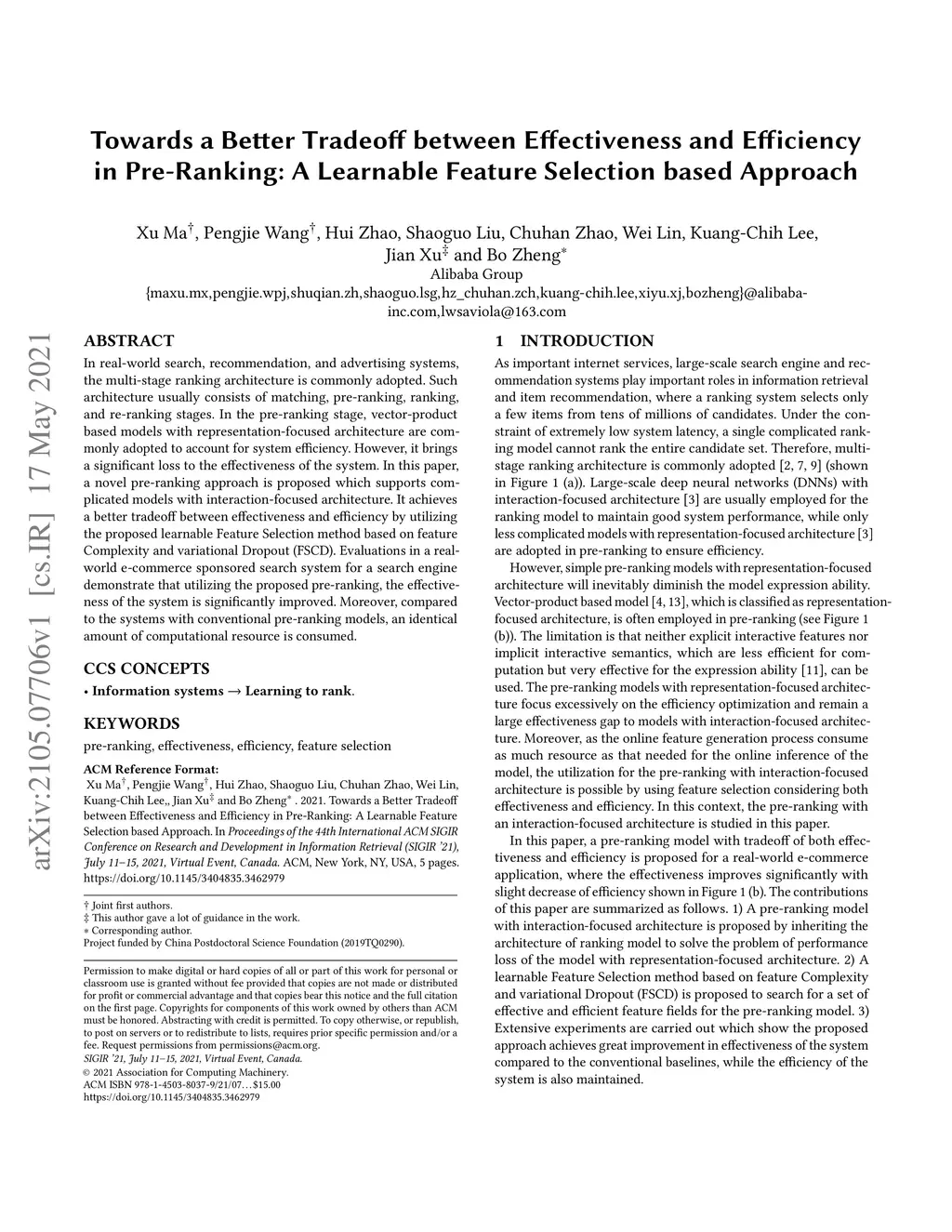 In real-world search, recommendation, and advertising systems, the multi-stage ranking architecture is commonly adopted. Such architecture usually consists of matching, pre-ranking, ranking, and re-ranking stages. In the pre-ranking stage, vector-product based models with representation-focused architecture are commonly adopted to account for system efficiency. However, it brings a significant loss to the effectiveness of the system. In this paper, a novel pre-ranking approach is proposed which supports complicated models with interaction-focused architecture. It achieves a better tradeoff between effectiveness and efficiency by utilizing the proposed learnable Feature Selection method based on feature Complexity and variational Dropout (FSCD). Evaluations in a real-world e-commerce sponsored search system for a search engine demonstrate that utilizing the proposed pre-ranking, the effectiveness of the system is significantly improved. Moreover, compared to the systems with conventional pre-ranking models, an identical amount of computational resource is consumed.