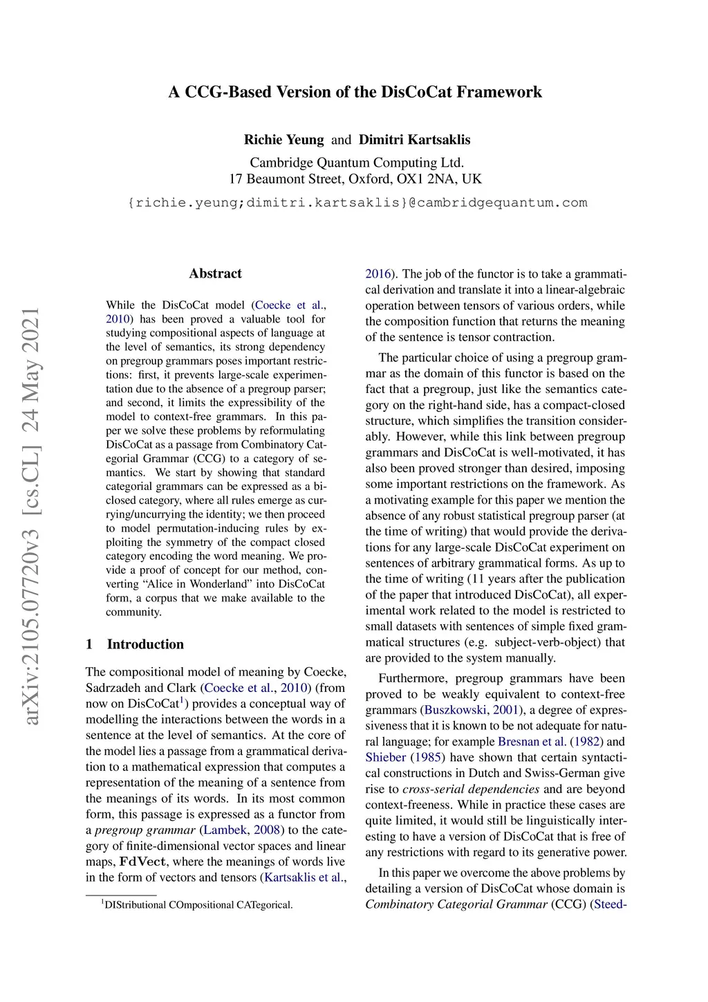 While the DisCoCat model (Coecke et al., 2010) has been proved a valuable tool for studying compositional aspects of language at the level of semantics, its strong dependency on pregroup grammars poses important restrictions: first, it prevents large-scale experimentation due to the absence of a pregroup parser; and second, it limits the expressibility of the model to context-free grammars. In this paper we solve these problems by reformulating DisCoCat as a passage from Combinatory Categorial Grammar (CCG) to a category of semantics. We start by showing that standard categorial grammars can be expressed as a biclosed category, where all rules emerge as currying/uncurrying the identity; we then proceed to model permutation-inducing rules by exploiting the symmetry of the compact closed category encoding the word meaning. We provide a proof of concept for our method, converting "Alice in Wonderland" into DisCoCat form, a corpus that we make available to the community.