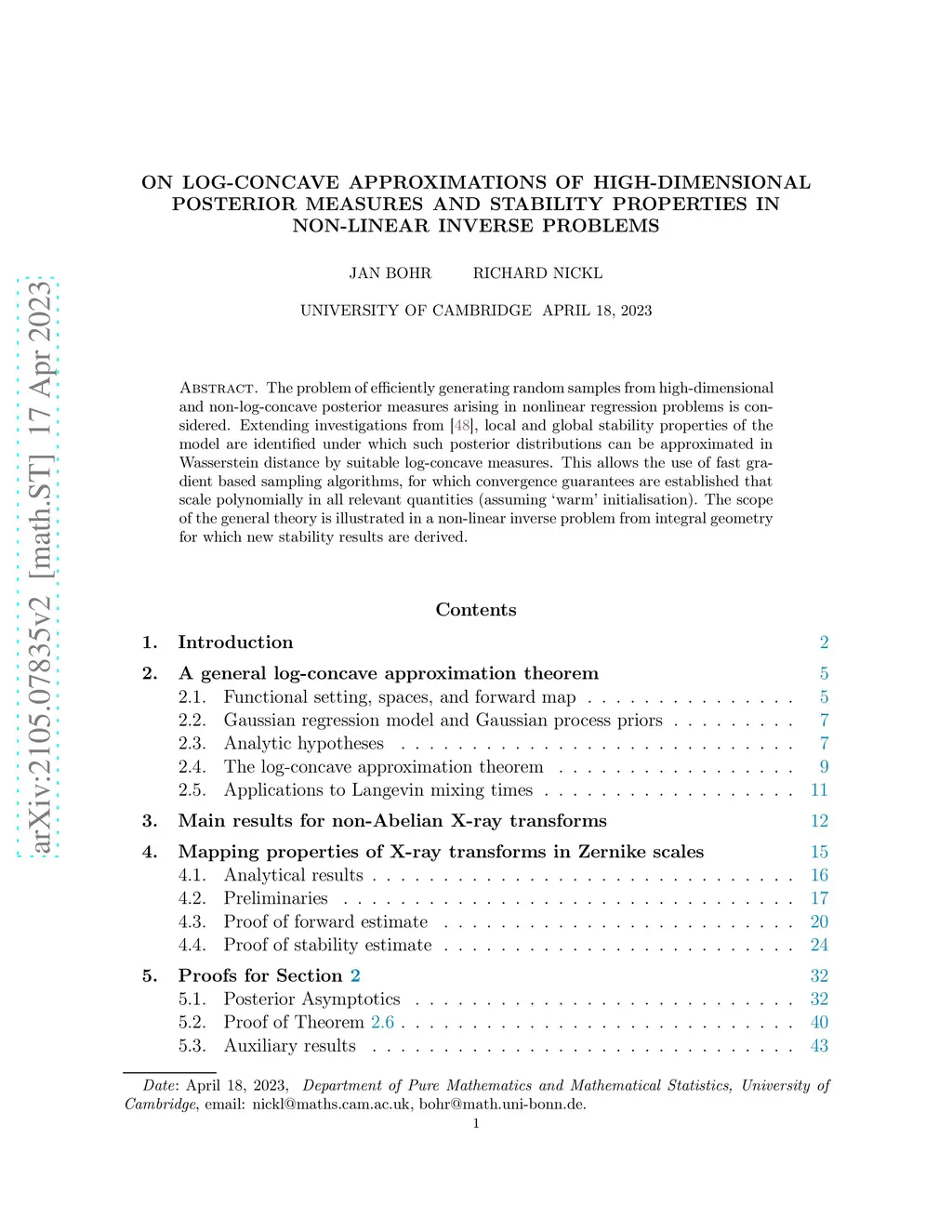 The problem of efficiently generating random samples from high-dimensional and non-log-concave posterior measures arising from nonlinear regression problems is considered. Extending investigations from arXiv:2009.05298, local and global stability properties of the model are identified under which such posterior distributions can be approximated in Wasserstein distance by suitable log-concave measures. This allows the use of fast gradient based sampling algorithms, for which convergence guarantees are established that scale polynomially in all relevant quantities (assuming `warm' initialisation). The scope of the general theory is illustrated in a non-linear inverse problem from integral geometry for which new stability results are derived.