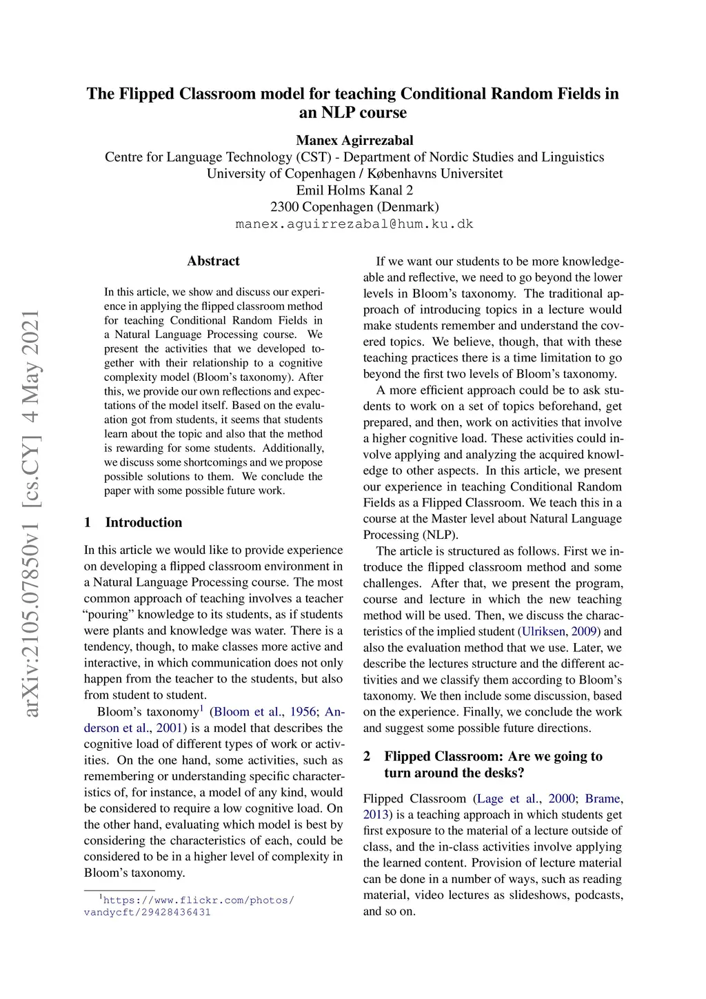 In this article, we show and discuss our experience in applying the flipped classroom method for teaching Conditional Random Fields in a Natural Language Processing course. We present the activities that we developed together with their relationship to a cognitive complexity model (Bloom's taxonomy). After this, we provide our own reflections and expectations of the model itself. Based on the evaluation got from students, it seems that students learn about the topic and also that the method is rewarding for some students. Additionally, we discuss some shortcomings and we propose possible solutions to them. We conclude the paper with some possible future work.