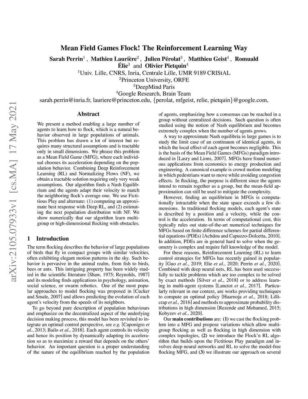 We present a method enabling a large number of agents to learn how to flock, which is a natural behavior observed in large populations of animals. This problem has drawn a lot of interest but requires many structural assumptions and is tractable only in small dimensions. We phrase this problem as a Mean Field Game (MFG), where each individual chooses its acceleration depending on the population behavior. Combining Deep Reinforcement Learning (RL) and Normalizing Flows (NF), we obtain a tractable solution requiring only very weak assumptions. Our algorithm finds a Nash Equilibrium and the agents adapt their velocity to match the neighboring flock's average one. We use Fictitious Play and alternate: (1) computing an approximate best response with Deep RL, and (2) estimating the next population distribution with NF. We show numerically that our algorithm learn multi-group or high-dimensional flocking with obstacles.