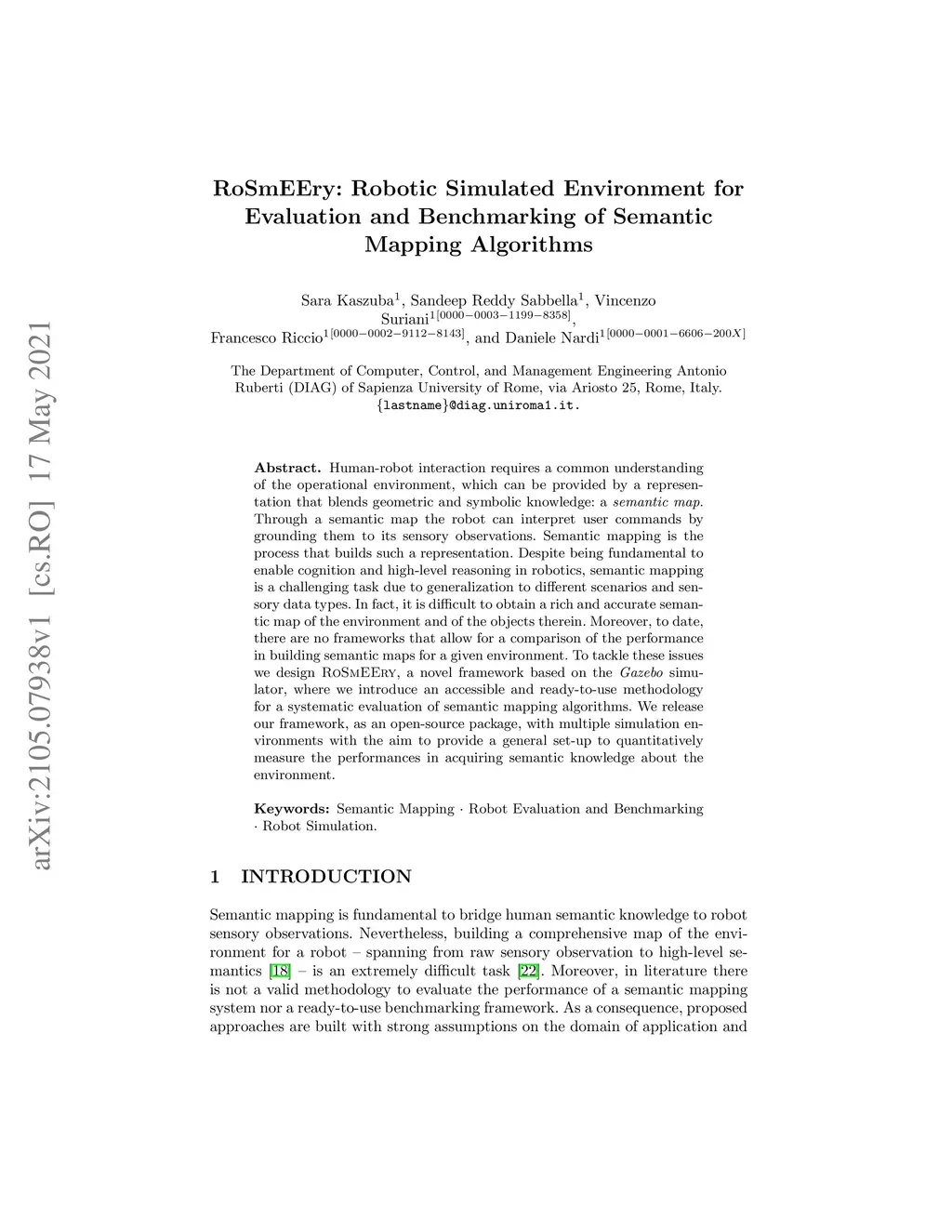 Human-robot interaction requires a common understanding of the operational environment, which can be provided by a representation that blends geometric and symbolic knowledge: a semantic map. Through a semantic map the robot can interpret user commands by grounding them to its sensory observations. Semantic mapping is the process that builds such a representation. Despite being fundamental to enable cognition and high-level reasoning in robotics, semantic mapping is a challenging task due to generalization to different scenarios and sensory data types. In fact, it is difficult to obtain a rich and accurate semantic map of the environment and of the objects therein. Moreover, to date, there are no frameworks that allow for a comparison of the performance in building semantic maps for a given environment. To tackle these issues we design RoSmEEry, a novel framework based on the Gazebo simulator, where we introduce an accessible and ready-to-use methodology for a systematic evaluation of semantic mapping algorithms. We release our framework, as an open-source package, with multiple simulation environments with the aim to provide a general set-up to quantitatively measure the performances in acquiring semantic knowledge about the environment.