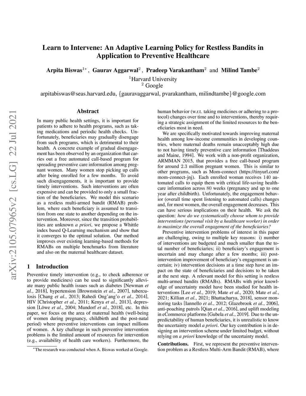 In many public health settings, it is important for patients to adhere to health programs, such as taking medications and periodic health checks. Unfortunately, beneficiaries may gradually disengage from such programs, which is detrimental to their health. A concrete example of gradual disengagement has been observed by an organization that carries out a free automated call-based program for spreading preventive care information among pregnant women. Many women stop picking up calls after being enrolled for a few months. To avoid such disengagements, it is important to provide timely interventions. Such interventions are often expensive and can be provided to only a small fraction of the beneficiaries. We model this scenario as a restless multi-armed bandit (RMAB) problem, where each beneficiary is assumed to transition from one state to another depending on the intervention. Moreover, since the transition probabilities are unknown a priori, we propose a Whittle index based Q-Learning mechanism and show that it converges to the optimal solution. Our method improves over existing learning-based methods for RMABs on multiple benchmarks from literature and also on the maternal healthcare dataset.