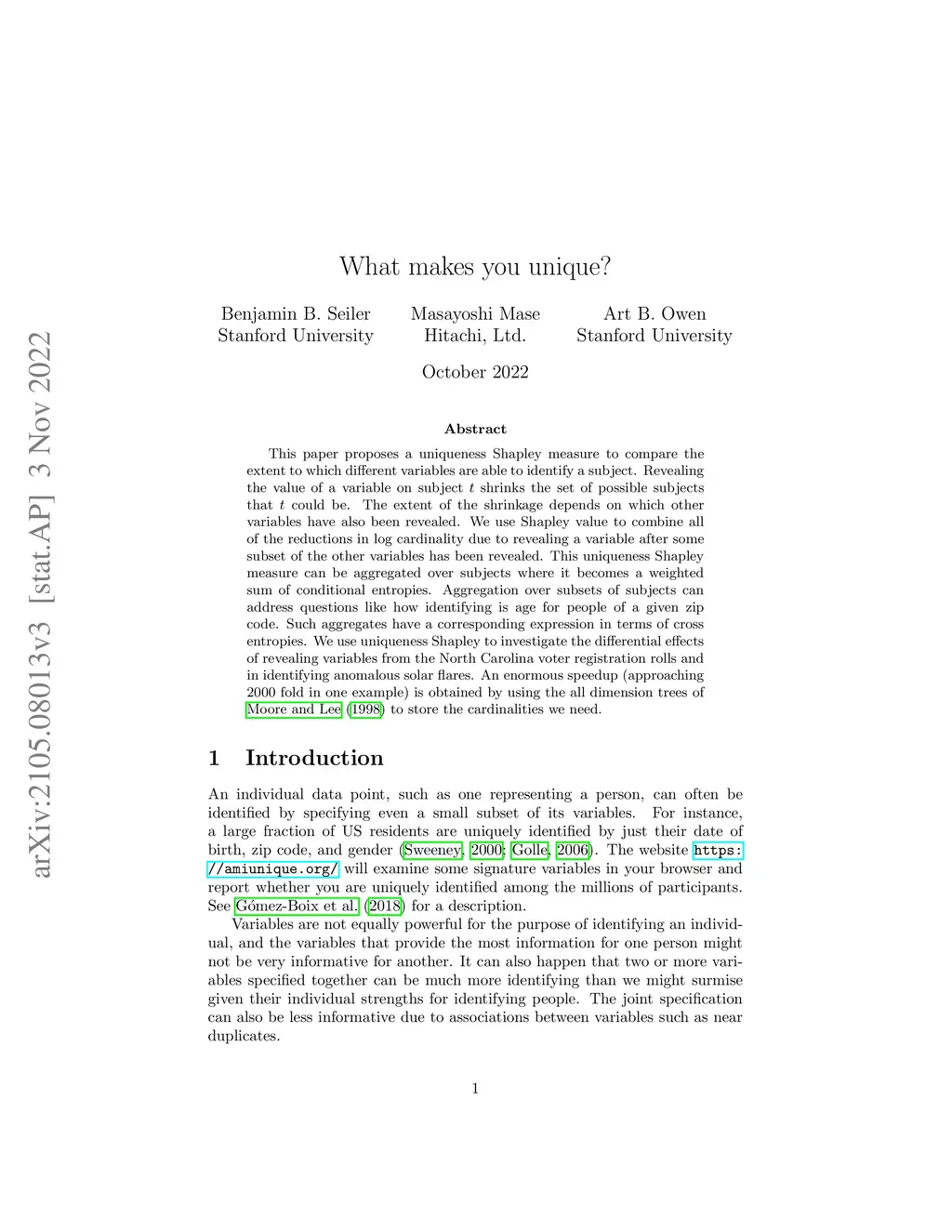 This paper proposes a uniqueness Shapley measure to compare the extent to which different variables are able to identify a subject. Revealing the value of a variable on subject shrinks the set of possible subjects that could be. The extent of the shrinkage depends on which other variables have also been revealed. We use Shapley value to combine all of the reductions in log cardinality due to revealing a variable after some subset of the other variables has been revealed. This uniqueness Shapley measure can be aggregated over subjects where it becomes a weighted sum of conditional entropies. Aggregation over subsets of subjects can address questions like how identifying is age for people of a given zip code. Such aggregates have a corresponding expression in terms of cross entropies. We use uniqueness Shapley to investigate the differential effects of revealing variables from the North Carolina voter registration rolls and in identifying anomalous solar flares. An enormous speedup (approaching 2000 fold in one example) is obtained by using the all dimension trees of Moore and Lee (1998) to store the cardinalities we need.