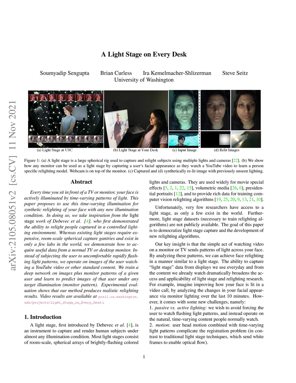 Every time you sit in front of a TV or monitor, your face is actively illuminated by time-varying patterns of light. This paper proposes to use this time-varying illumination for synthetic relighting of your face with any new illumination condition. In doing so, we take inspiration from the light stage work of Debevec et al., who first demonstrated the ability to relight people captured in a controlled lighting environment. Whereas existing light stages require expensive, room-scale spherical capture gantries and exist in only a few labs in the world, we demonstrate how to acquire useful data from a normal TV or desktop monitor. Instead of subjecting the user to uncomfortable rapidly flashing light patterns, we operate on images of the user watching a YouTube video or other standard content. We train a deep network on images plus monitor patterns of a given user and learn to predict images of that user under any target illumination (monitor pattern). Experimental evaluation shows that our method produces realistic relighting results. Video results are available at http://grail.cs.washington.edu/projects/Light_Stage_on_Every_Desk/.