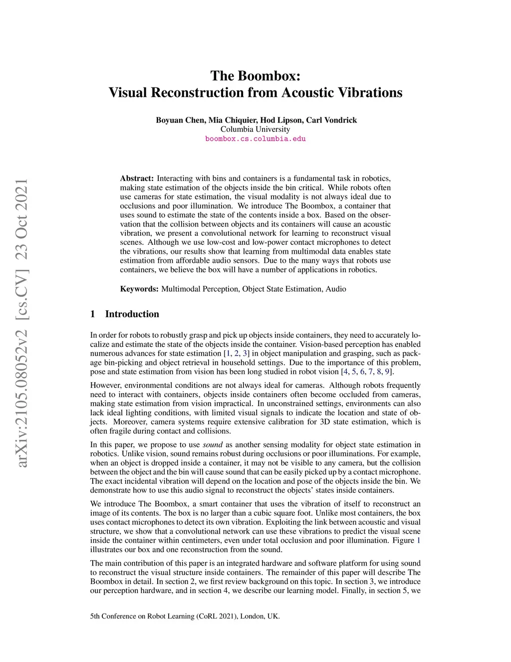 Interacting with bins and containers is a fundamental task in robotics, making state estimation of the objects inside the bin critical. While robots often use cameras for state estimation, the visual modality is not always ideal due to occlusions and poor illumination. We introduce The Boombox, a container that uses sound to estimate the state of the contents inside a box. Based on the observation that the collision between objects and its containers will cause an acoustic vibration, we present a convolutional network for learning to reconstruct visual scenes. Although we use low-cost and low-power contact microphones to detect the vibrations, our results show that learning from multimodal data enables state estimation from affordable audio sensors. Due to the many ways that robots use containers, we believe the box will have a number of applications in robotics. Our project website is at: boombox.cs.columbia.edu