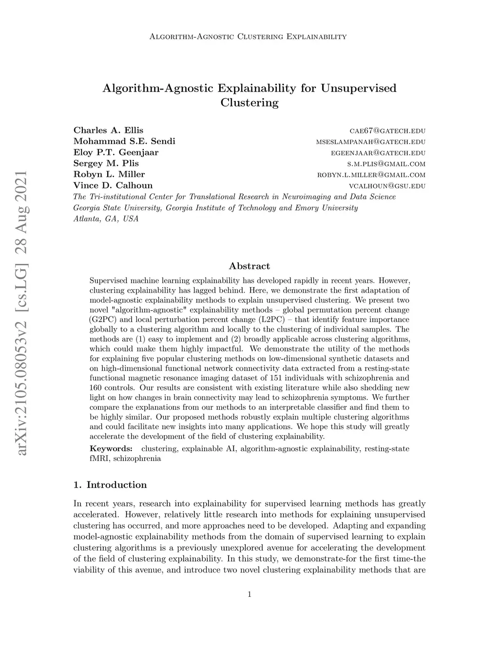 Supervised machine learning explainability has developed rapidly in recent years. However, clustering explainability has lagged behind. Here, we demonstrate the first adaptation of model-agnostic explainability methods to explain unsupervised clustering. We present two novel "algorithm-agnostic" explainability methods - global permutation percent change (G2PC) and local perturbation percent change (L2PC) - that identify feature importance globally to a clustering algorithm and locally to the clustering of individual samples. The methods are (1) easy to implement and (2) broadly applicable across clustering algorithms, which could make them highly impactful. We demonstrate the utility of the methods for explaining five popular clustering methods on low-dimensional synthetic datasets and on high-dimensional functional network connectivity data extracted from a resting-state functional magnetic resonance imaging dataset of 151 individuals with schizophrenia and 160 controls. Our results are consistent with existing literature while also shedding new light on how changes in brain connectivity may lead to schizophrenia symptoms. We further compare the explanations from our methods to an interpretable classifier and find them to be highly similar. Our proposed methods robustly explain multiple clustering algorithms and could facilitate new insights into many applications. We hope this study will greatly accelerate the development of the field of clustering explainability.