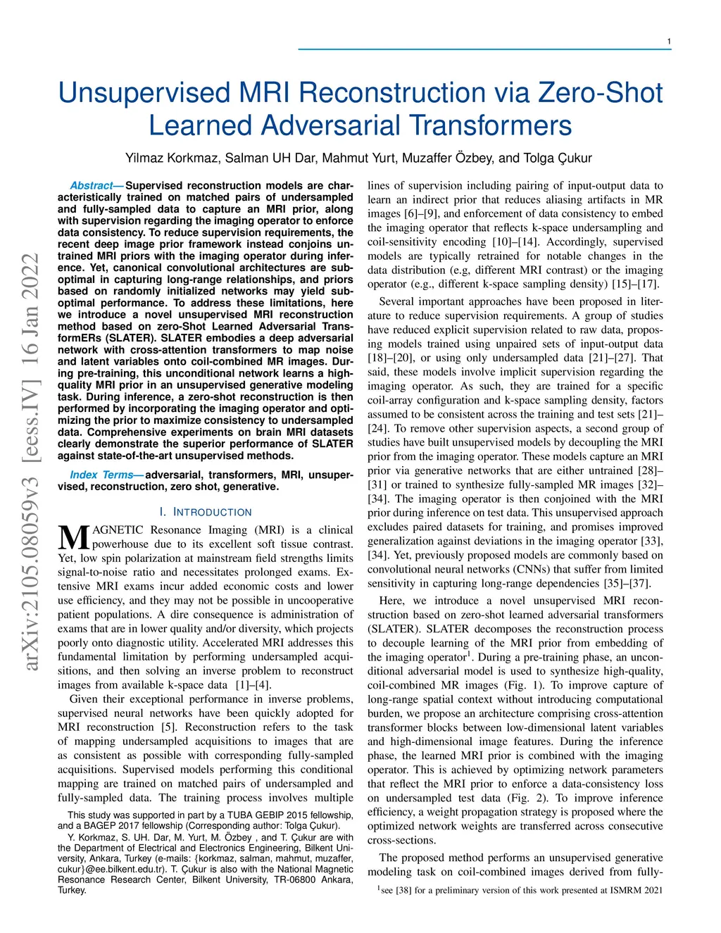 Supervised reconstruction models are characteristically trained on matched pairs of undersampled and fully-sampled data to capture an MRI prior, along with supervision regarding the imaging operator to enforce data consistency. To reduce supervision requirements, the recent deep image prior framework instead conjoins untrained MRI priors with the imaging operator during inference. Yet, canonical convolutional architectures are suboptimal in capturing long-range relationships, and priors based on randomly initialized networks may yield suboptimal performance. To address these limitations, here we introduce a novel unsupervised MRI reconstruction method based on zero-Shot Learned Adversarial TransformERs (SLATER). SLATER embodies a deep adversarial network with cross-attention transformers to map noise and latent variables onto coil-combined MR images. During pre-training, this unconditional network learns a high-quality MRI prior in an unsupervised generative modeling task. During inference, a zero-shot reconstruction is then performed by incorporating the imaging operator and optimizing the prior to maximize consistency to undersampled data. Comprehensive experiments on brain MRI datasets clearly demonstrate the superior performance of SLATER against state-of-the-art unsupervised methods.