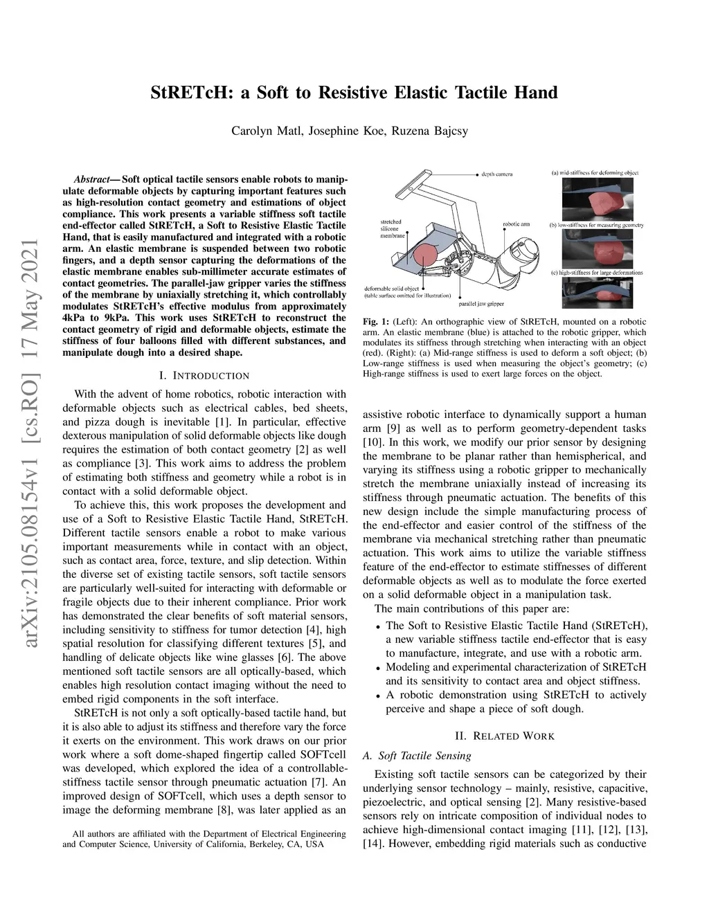 Soft optical tactile sensors enable robots to manipulate deformable objects by capturing important features such as high-resolution contact geometry and estimations of object compliance. This work presents a variable stiffness soft tactile end-effector called StRETcH, a Soft to Resistive Elastic Tactile Hand, that is easily manufactured and integrated with a robotic arm. An elastic membrane is suspended between two robotic fingers, and a depth sensor capturing the deformations of the elastic membrane enables sub-millimeter accurate estimates of contact geometries. The parallel-jaw gripper varies the stiffness of the membrane by uni-axially stretching it, which controllably modulates StRETcH's effective modulus from approximately 4kPa to 9kPa. This work uses StRETcH to reconstruct the contact geometry of rigid and deformable objects, estimate the stiffness of four balloons filled with different substances, and manipulate dough into a desired shape.