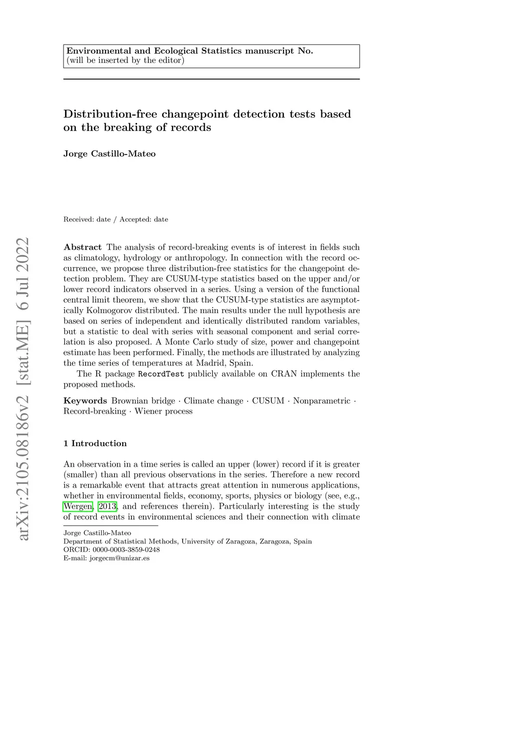 The analysis of record-breaking events is of interest in fields such as climatology, hydrology or anthropology. In connection with the record occurrence, we propose three distribution-free statistics for the changepoint detection problem. They are CUSUM-type statistics based on the upper and/or lower record indicators observed in a series. Using a version of the functional central limit theorem, we show that the CUSUM-type statistics are asymptotically Kolmogorov distributed. The main results under the null hypothesis are based on series of independent and identically distributed random variables, but a statistic to deal with series with seasonal component and serial correlation is also proposed. A Monte Carlo study of size, power and changepoint estimate has been performed. Finally, the methods are illustrated by analyzing the time series of temperatures at Madrid, Spain. The R package publicly available on CRAN implements the proposed methods.