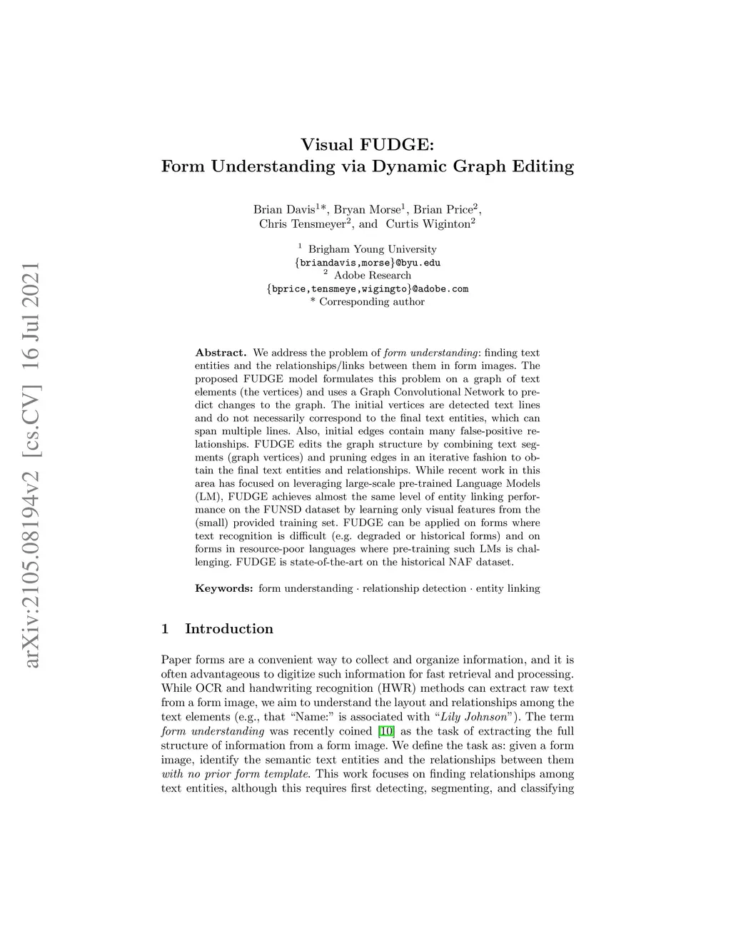 We address the problem of form understanding: finding text entities and the relationships/links between them in form images. The proposed FUDGE model formulates this problem on a graph of text elements (the vertices) and uses a Graph Convolutional Network to predict changes to the graph. The initial vertices are detected text lines and do not necessarily correspond to the final text entities, which can span multiple lines. Also, initial edges contain many false-positive relationships. FUDGE edits the graph structure by combining text segments (graph vertices) and pruning edges in an iterative fashion to obtain the final text entities and relationships. While recent work in this area has focused on leveraging large-scale pre-trained Language Models (LM), FUDGE achieves almost the same level of entity linking performance on the FUNSD dataset by learning only visual features from the (small) provided training set. FUDGE can be applied on forms where text recognition is difficult (e.g. degraded or historical forms) and on forms in resource-poor languages where pre-training such LMs is challenging. FUDGE is state-of-the-art on the historical NAF dataset.