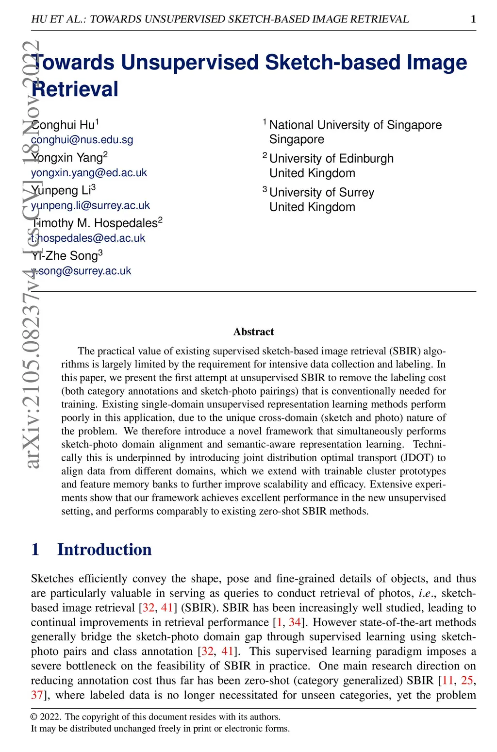 The practical value of existing supervised sketch-based image retrieval (SBIR) algorithms is largely limited by the requirement for intensive data collection and labeling. In this paper, we present the first attempt at unsupervised SBIR to remove the labeling cost (both category annotations and sketch-photo pairings) that is conventionally needed for training. Existing single-domain unsupervised representation learning methods perform poorly in this application, due to the unique cross-domain (sketch and photo) nature of the problem. We therefore introduce a novel framework that simultaneously performs sketch-photo domain alignment and semantic-aware representation learning. Technically this is underpinned by introducing joint distribution optimal transport (JDOT) to align data from different domains, which we extend with trainable cluster prototypes and feature memory banks to further improve scalability and efficacy. Extensive experiments show that our framework achieves excellent performance in the new unsupervised setting, and performs comparably or better than state-of-the-art in the zero-shot setting.