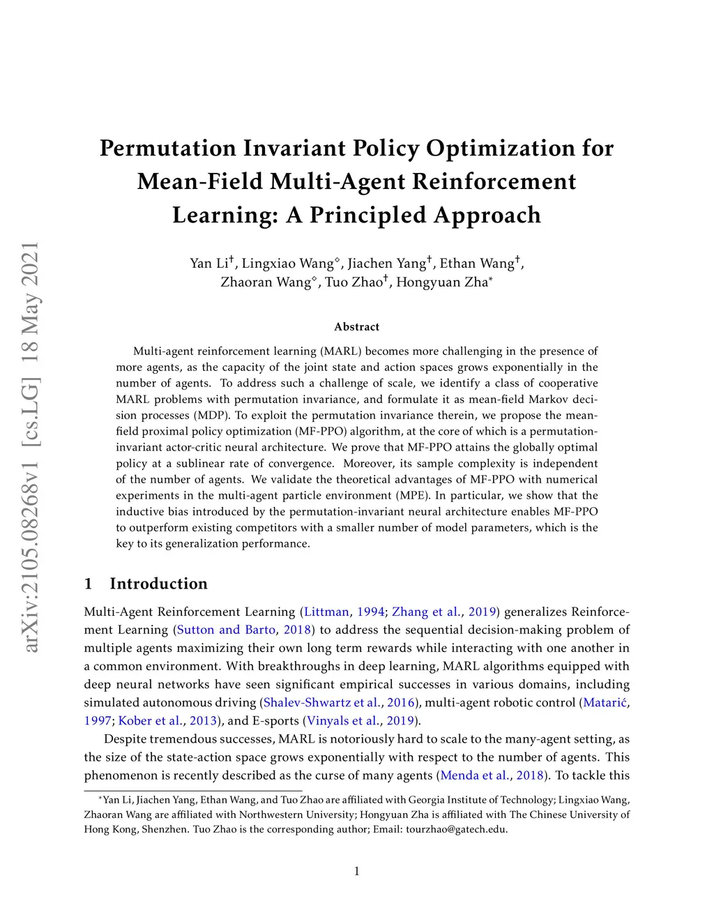 Multi-agent reinforcement learning (MARL) becomes more challenging in the presence of more agents, as the capacity of the joint state and action spaces grows exponentially in the number of agents. To address such a challenge of scale, we identify a class of cooperative MARL problems with permutation invariance, and formulate it as a mean-field Markov decision processes (MDP). To exploit the permutation invariance therein, we propose the mean-field proximal policy optimization (MF-PPO) algorithm, at the core of which is a permutation-invariant actor-critic neural architecture. We prove that MF-PPO attains the globally optimal policy at a sublinear rate of convergence. Moreover, its sample complexity is independent of the number of agents. We validate the theoretical advantages of MF-PPO with numerical experiments in the multi-agent particle environment (MPE). In particular, we show that the inductive bias introduced by the permutation-invariant neural architecture enables MF-PPO to outperform existing competitors with a smaller number of model parameters, which is the key to its generalization performance.