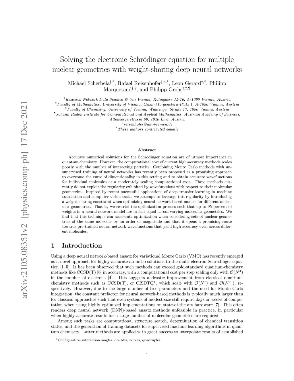 Accurate numerical solutions for the Schr\"odinger equation are of utmost importance in quantum chemistry. However, the computational cost of current high-accuracy methods scales poorly with the number of interacting particles. Combining Monte Carlo methods with unsupervised training of neural networks has recently been proposed as a promising approach to overcome the curse of dimensionality in this setting and to obtain accurate wavefunctions for individual molecules at a moderately scaling computational cost. These methods currently do not exploit the regularity exhibited by wavefunctions with respect to their molecular geometries. Inspired by recent successful applications of deep transfer learning in machine translation and computer vision tasks, we attempt to leverage this regularity by introducing a weight-sharing constraint when optimizing neural network-based models for different molecular geometries. That is, we restrict the optimization process such that up to 95 percent of weights in a neural network model are in fact equal across varying molecular geometries. We find that this technique can accelerate optimization when considering sets of nuclear geometries of the same molecule by an order of magnitude and that it opens a promising route towards pre-trained neural network wavefunctions that yield high accuracy even across different molecules.