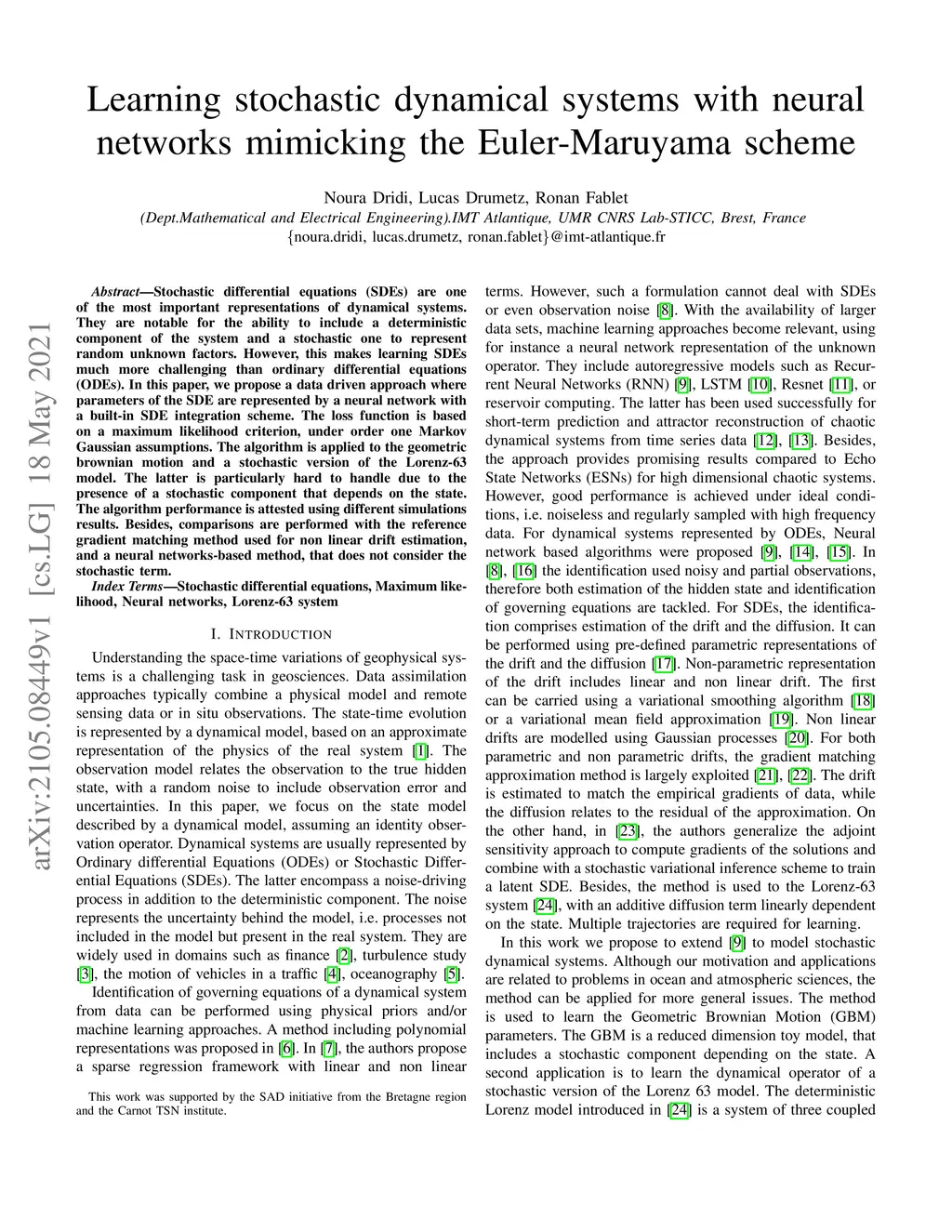 Stochastic differential equations (SDEs) are one of the most important representations of dynamical systems. They are notable for the ability to include a deterministic component of the system and a stochastic one to represent random unknown factors. However, this makes learning SDEs much more challenging than ordinary differential equations (ODEs). In this paper, we propose a data driven approach where parameters of the SDE are represented by a neural network with a built-in SDE integration scheme. The loss function is based on a maximum likelihood criterion, under order one Markov Gaussian assumptions. The algorithm is applied to the geometric brownian motion and a stochastic version of the Lorenz-63 model. The latter is particularly hard to handle due to the presence of a stochastic component that depends on the state. The algorithm performance is attested using different simulations results. Besides, comparisons are performed with the reference gradient matching method used for non linear drift estimation, and a neural networks-based method, that does not consider the stochastic term.