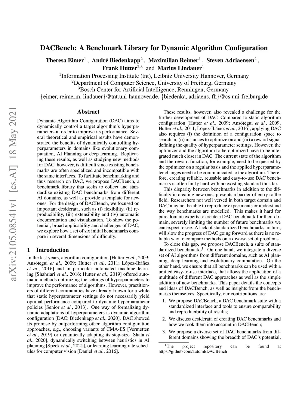 Dynamic Algorithm Configuration (DAC) aims to dynamically control a target algorithm's hyperparameters in order to improve its performance. Several theoretical and empirical results have demonstrated the benefits of dynamically controlling hyperparameters in domains like evolutionary computation, AI Planning or deep learning. Replicating these results, as well as studying new methods for DAC, however, is difficult since existing benchmarks are often specialized and incompatible with the same interfaces. To facilitate benchmarking and thus research on DAC, we propose DACBench, a benchmark library that seeks to collect and standardize existing DAC benchmarks from different AI domains, as well as provide a template for new ones. For the design of DACBench, we focused on important desiderata, such as (i) flexibility, (ii) reproducibility, (iii) extensibility and (iv) automatic documentation and visualization. To show the potential, broad applicability and challenges of DAC, we explore how a set of six initial benchmarks compare in several dimensions of difficulty.