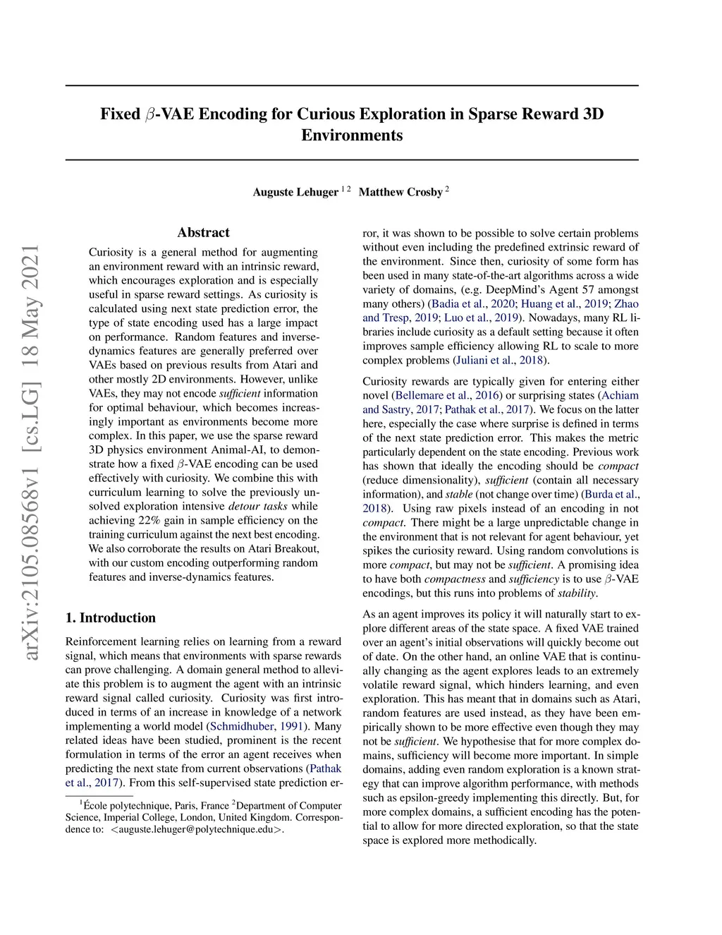 Curiosity is a general method for augmenting an environment reward with an intrinsic reward, which encourages exploration and is especially useful in sparse reward settings. As curiosity is calculated using next state prediction error, the type of state encoding used has a large impact on performance. Random features and inverse-dynamics features are generally preferred over VAEs based on previous results from Atari and other mostly 2D environments. However, unlike VAEs, they may not encode sufficient information for optimal behaviour, which becomes increasingly important as environments become more complex. In this paper, we use the sparse reward 3D physics environment Animal-AI, to demonstrate how a fixed -VAE encoding can be used effectively with curiosity. We combine this with curriculum learning to solve the previously unsolved exploration intensive detour tasks while achieving 22\% gain in sample efficiency on the training curriculum against the next best encoding. We also corroborate the results on Atari Breakout, with our custom encoding outperforming random features and inverse-dynamics features.