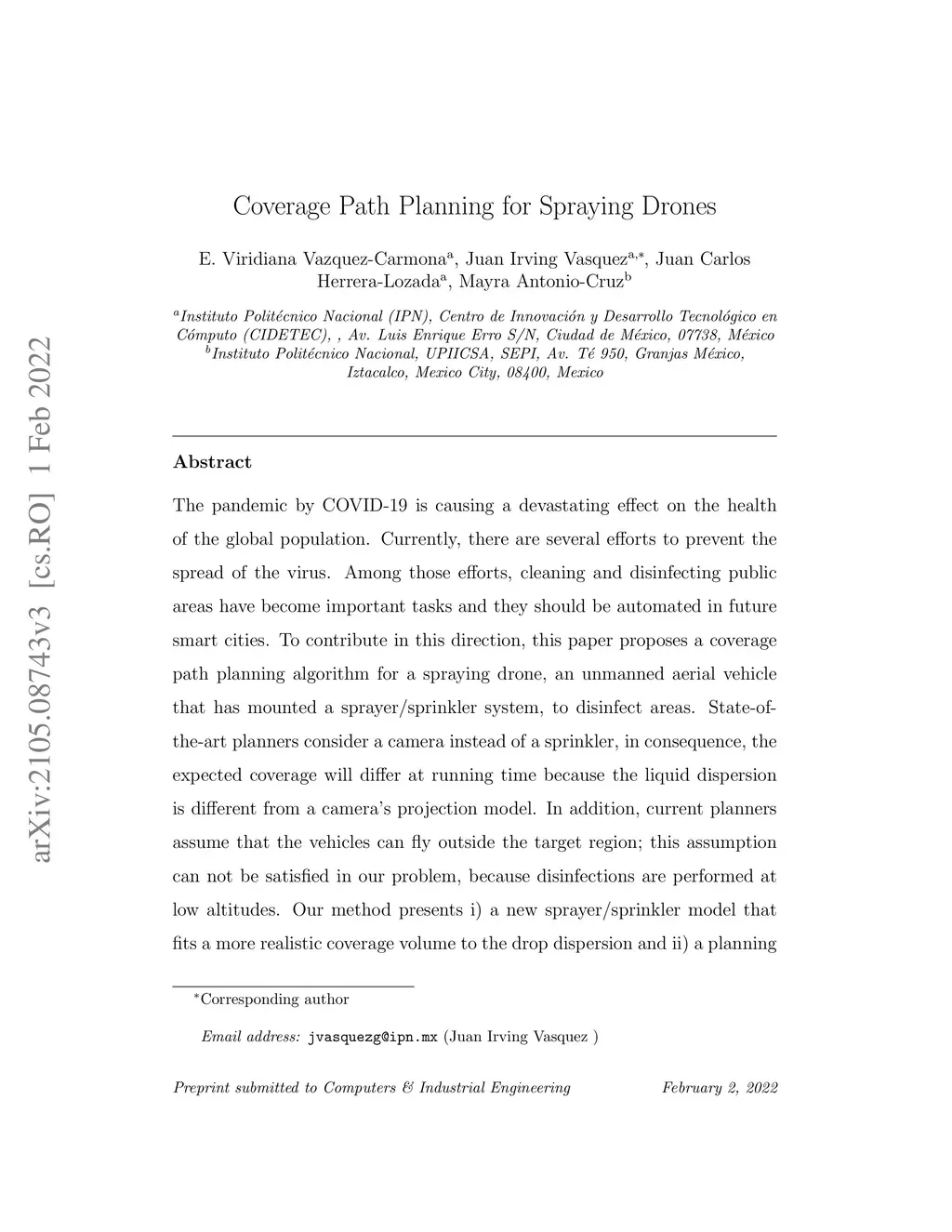 The pandemic by COVID-19 is causing a devastating effect on the health of global population. There are several efforts to prevent the spread of the virus. Among those efforts, cleaning and disinfecting public areas have become important tasks. In order to contribute in this direction, this paper proposes a coverage path planning algorithm for a spraying drone, a micro aerial vehicle that has mounted a sprayer/sprinkler system, to disinfect areas. In contrast with planners in the state-of-the-art, this proposal presents i) a new sprayer/sprinkler model that fits a more realistic coverage volume to the drop dispersion and ii) a planning algorithm that efficiently restricts the flight to the region of interest avoiding potential collisions in bounded scenes. The drone with the algorithm has been tested in several simulation scenes, showing that the algorithm is effective and covers more areas with respect to other approaches in the literature. Note that the proposal is not limited to disinfection applications, but can be applied to other ones, such as painting or precision agriculture.