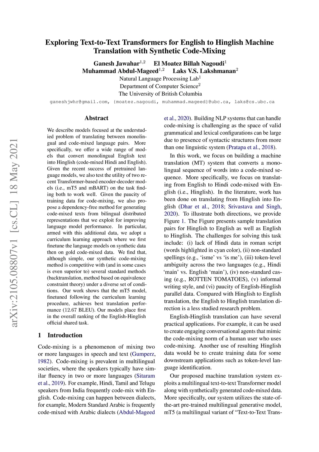 We describe models focused at the understudied problem of translating between monolingual and code-mixed language pairs. More specifically, we offer a wide range of models that convert monolingual English text into Hinglish (code-mixed Hindi and English). Given the recent success of pretrained language models, we also test the utility of two recent Transformer-based encoder-decoder models (i.e., mT5 and mBART) on the task finding both to work well. Given the paucity of training data for code-mixing, we also propose a dependency-free method for generating code-mixed texts from bilingual distributed representations that we exploit for improving language model performance. In particular, armed with this additional data, we adopt a curriculum learning approach where we first finetune the language models on synthetic data then on gold code-mixed data. We find that, although simple, our synthetic code-mixing method is competitive with (and in some cases is even superior to) several standard methods (backtranslation, method based on equivalence constraint theory) under a diverse set of conditions. Our work shows that the mT5 model, finetuned following the curriculum learning procedure, achieves best translation performance (12.67 BLEU). Our models place first in the overall ranking of the English-Hinglish official shared task.