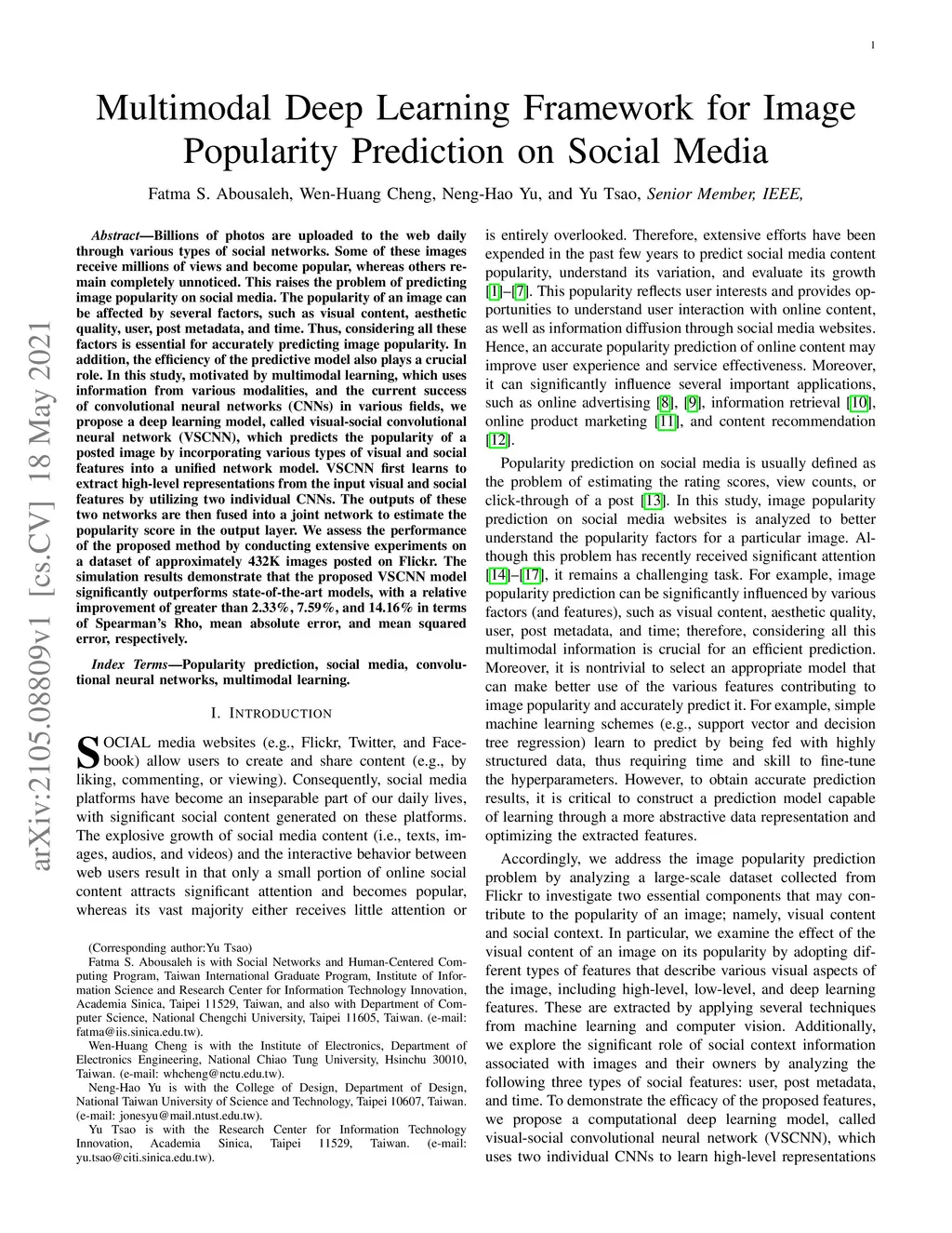 Billions of photos are uploaded to the web daily through various types of social networks. Some of these images receive millions of views and become popular, whereas others remain completely unnoticed. This raises the problem of predicting image popularity on social media. The popularity of an image can be affected by several factors, such as visual content, aesthetic quality, user, post metadata, and time. Thus, considering all these factors is essential for accurately predicting image popularity. In addition, the efficiency of the predictive model also plays a crucial role. In this study, motivated by multimodal learning, which uses information from various modalities, and the current success of convolutional neural networks (CNNs) in various fields, we propose a deep learning model, called visual-social convolutional neural network (VSCNN), which predicts the popularity of a posted image by incorporating various types of visual and social features into a unified network model. VSCNN first learns to extract high-level representations from the input visual and social features by utilizing two individual CNNs. The outputs of these two networks are then fused into a joint network to estimate the popularity score in the output layer. We assess the performance of the proposed method by conducting extensive experiments on a dataset of approximately 432K images posted on Flickr. The simulation results demonstrate that the proposed VSCNN model significantly outperforms state-of-the-art models, with a relative improvement of greater than 2.33%, 7.59%, and 14.16% in terms of Spearman's Rho, mean absolute error, and mean squared error, respectively.