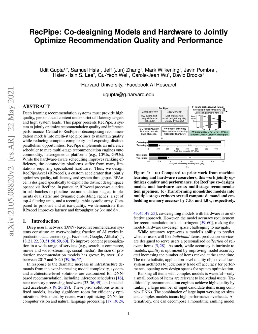 Deep learning recommendation systems must provide high quality, personalized content under strict tail-latency targets and high system loads. This paper presents RecPipe, a system to jointly optimize recommendation quality and inference performance. Central to RecPipe is decomposing recommendation models into multi-stage pipelines to maintain quality while reducing compute complexity and exposing distinct parallelism opportunities. RecPipe implements an inference scheduler to map multi-stage recommendation engines onto commodity, heterogeneous platforms (e.g., CPUs, GPUs).While the hardware-aware scheduling improves ranking efficiency, the commodity platforms suffer from many limitations requiring specialized hardware. Thus, we design RecPipeAccel (RPAccel), a custom accelerator that jointly optimizes quality, tail-latency, and system throughput. RPAc-cel is designed specifically to exploit the distinct design space opened via RecPipe. In particular, RPAccel processes queries in sub-batches to pipeline recommendation stages, implements dual static and dynamic embedding caches, a set of top-k filtering units, and a reconfigurable systolic array. Com-pared to prior-art and at iso-quality, we demonstrate that RPAccel improves latency and throughput by 3x and 6x.