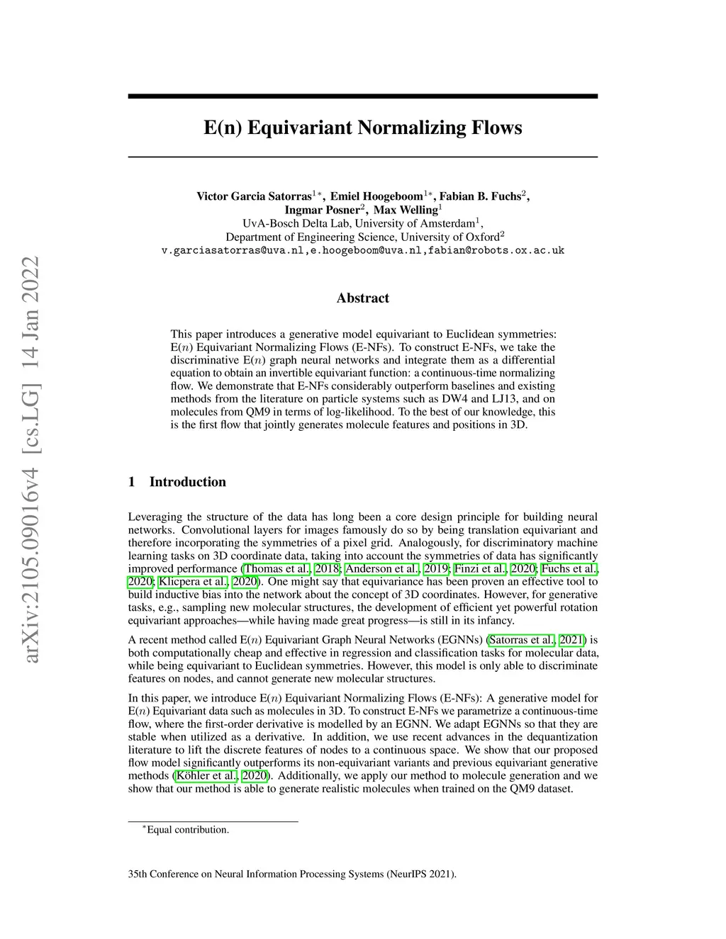 This paper introduces a generative model equivariant to Euclidean symmetries: E(n) Equivariant Normalizing Flows (E-NFs). To construct E-NFs, we take the discriminative E(n) graph neural networks and integrate them as a differential equation to obtain an invertible equivariant function: a continuous-time normalizing flow. We demonstrate that E-NFs considerably outperform baselines and existing methods from the literature on particle systems such as DW4 and LJ13, and on molecules from QM9 in terms of log-likelihood. To the best of our knowledge, this is the first flow that jointly generates molecule features and positions in 3D.