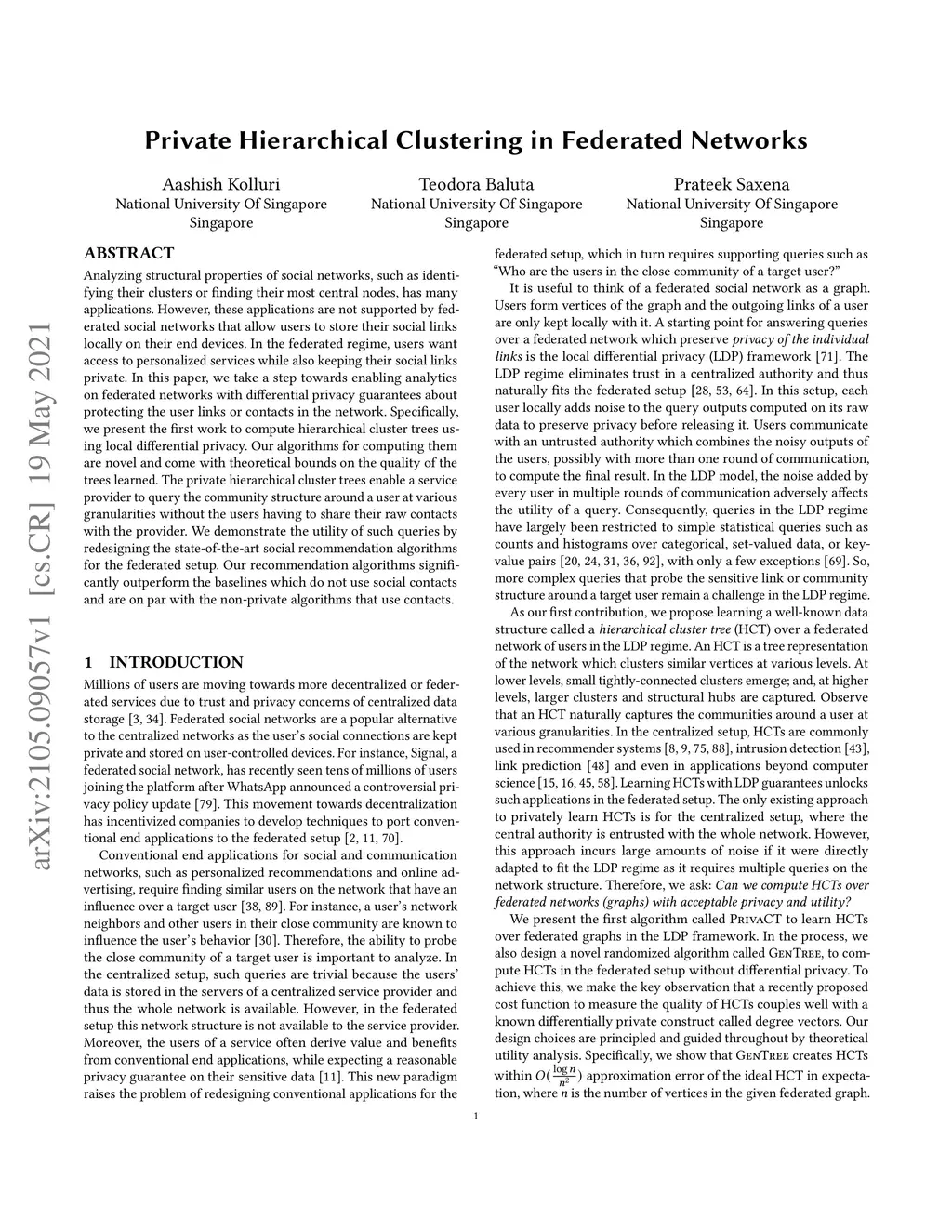 Analyzing structural properties of social networks, such as identifying their clusters or finding their most central nodes, has many applications. However, these applications are not supported by federated social networks that allow users to store their social links locally on their end devices. In the federated regime, users want access to personalized services while also keeping their social links private. In this paper, we take a step towards enabling analytics on federated networks with differential privacy guarantees about protecting the user links or contacts in the network. Specifically, we present the first work to compute hierarchical cluster trees using local differential privacy. Our algorithms for computing them are novel and come with theoretical bounds on the quality of the trees learned. The private hierarchical cluster trees enable a service provider to query the community structure around a user at various granularities without the users having to share their raw contacts with the provider. We demonstrate the utility of such queries by redesigning the state-of-the-art social recommendation algorithms for the federated setup. Our recommendation algorithms significantly outperform the baselines which do not use social contacts and are on par with the non-private algorithms that use contacts.