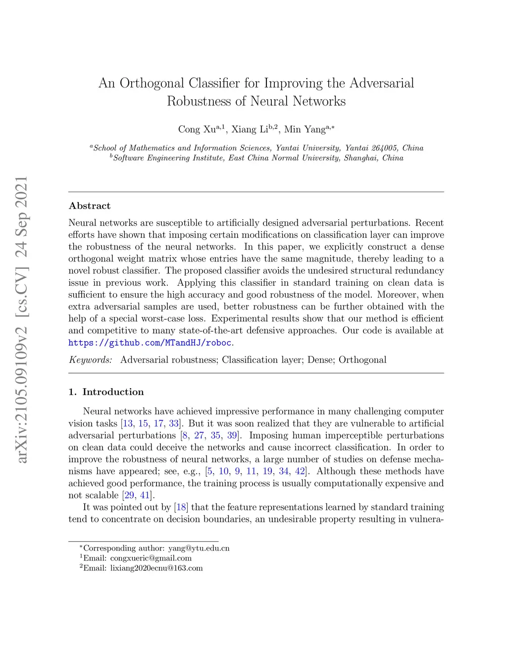 Neural networks are susceptible to artificially designed adversarial perturbations. Recent efforts have shown that imposing certain modifications on classification layer can improve the robustness of the neural networks. In this paper, we explicitly construct a dense orthogonal weight matrix whose entries have the same magnitude, thereby leading to a novel robust classifier. The proposed classifier avoids the undesired structural redundancy issue in previous work. Applying this classifier in standard training on clean data is sufficient to ensure the high accuracy and good robustness of the model. Moreover, when extra adversarial samples are used, better robustness can be further obtained with the help of a special worst-case loss. Experimental results show that our method is efficient and competitive to many state-of-the-art defensive approaches. Our code is available at \url{https://github.com/MTandHJ/roboc}.