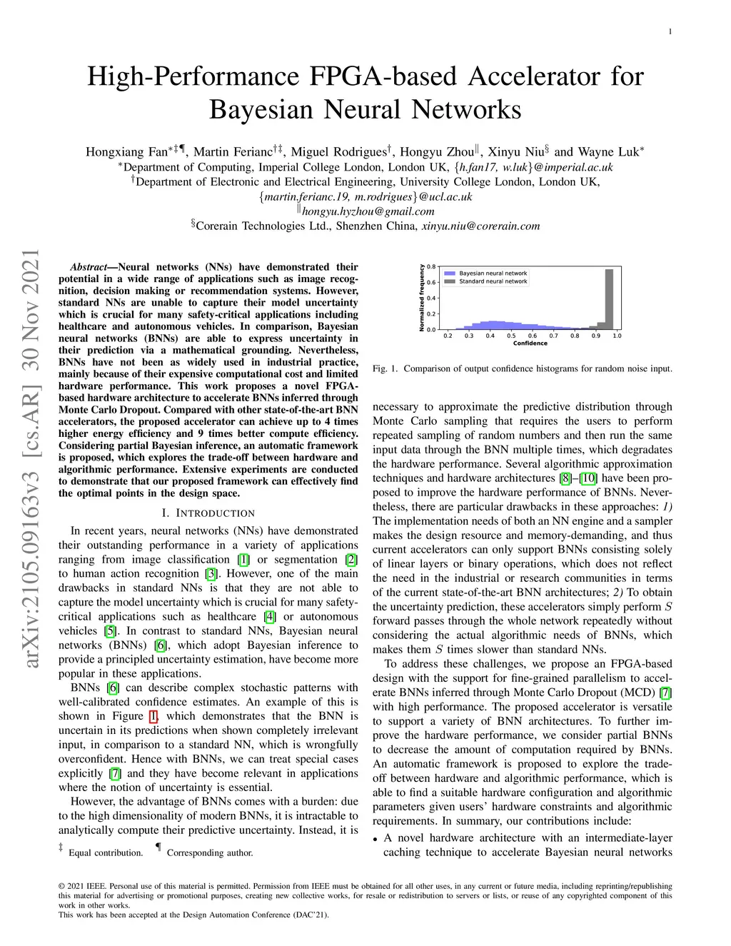 Neural networks (NNs) have demonstrated their potential in a wide range of applications such as image recognition, decision making or recommendation systems. However, standard NNs are unable to capture their model uncertainty which is crucial for many safety-critical applications including healthcare and autonomous vehicles. In comparison, Bayesian neural networks (BNNs) are able to express uncertainty in their prediction via a mathematical grounding. Nevertheless, BNNs have not been as widely used in industrial practice, mainly because of their expensive computational cost and limited hardware performance. This work proposes a novel FPGA-based hardware architecture to accelerate BNNs inferred through Monte Carlo Dropout. Compared with other state-of-the-art BNN accelerators, the proposed accelerator can achieve up to 4 times higher energy efficiency and 9 times better compute efficiency. Considering partial Bayesian inference, an automatic framework is proposed, which explores the trade-off between hardware and algorithmic performance. Extensive experiments are conducted to demonstrate that our proposed framework can effectively find the optimal points in the design space.