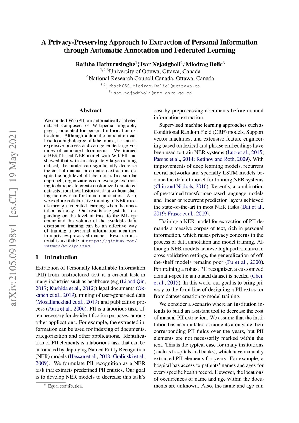 We curated WikiPII, an automatically labeled dataset composed of Wikipedia biography pages, annotated for personal information extraction. Although automatic annotation can lead to a high degree of label noise, it is an inexpensive process and can generate large volumes of annotated documents. We trained a BERT-based NER model with WikiPII and showed that with an adequately large training dataset, the model can significantly decrease the cost of manual information extraction, despite the high level of label noise. In a similar approach, organizations can leverage text mining techniques to create customized annotated datasets from their historical data without sharing the raw data for human annotation. Also, we explore collaborative training of NER models through federated learning when the annotation is noisy. Our results suggest that depending on the level of trust to the ML operator and the volume of the available data, distributed training can be an effective way of training a personal information identifier in a privacy-preserved manner. Research material is available at https://github.com/ratmcu/wikipiifed.