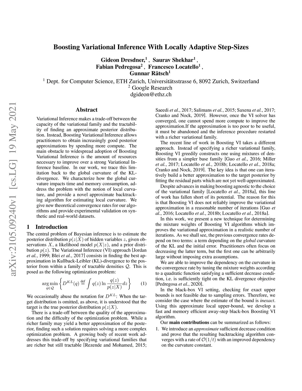 Variational Inference makes a trade-off between the capacity of the variational family and the tractability of finding an approximate posterior distribution. Instead, Boosting Variational Inference allows practitioners to obtain increasingly good posterior approximations by spending more compute. The main obstacle to widespread adoption of Boosting Variational Inference is the amount of resources necessary to improve over a strong Variational Inference baseline. In our work, we trace this limitation back to the global curvature of the KL-divergence. We characterize how the global curvature impacts time and memory consumption, address the problem with the notion of local curvature, and provide a novel approximate backtracking algorithm for estimating local curvature. We give new theoretical convergence rates for our algorithms and provide experimental validation on synthetic and real-world datasets.