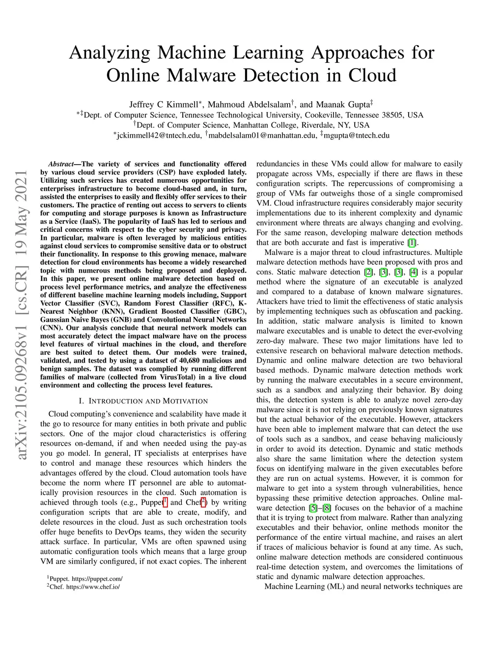 The variety of services and functionality offered by various cloud service providers (CSP) have exploded lately. Utilizing such services has created numerous opportunities for enterprises infrastructure to become cloud-based and, in turn, assisted the enterprises to easily and flexibly offer services to their customers. The practice of renting out access to servers to clients for computing and storage purposes is known as Infrastructure as a Service (IaaS). The popularity of IaaS has led to serious and critical concerns with respect to the cyber security and privacy. In particular, malware is often leveraged by malicious entities against cloud services to compromise sensitive data or to obstruct their functionality. In response to this growing menace, malware detection for cloud environments has become a widely researched topic with numerous methods being proposed and deployed. In this paper, we present online malware detection based on process level performance metrics, and analyze the effectiveness of different baseline machine learning models including, Support Vector Classifier (SVC), Random Forest Classifier (RFC), KNearest Neighbor (KNN), Gradient Boosted Classifier (GBC), Gaussian Naive Bayes (GNB) and Convolutional Neural Networks (CNN). Our analysis conclude that neural network models can most accurately detect the impact malware have on the process level features of virtual machines in the cloud, and therefore are best suited to detect them. Our models were trained, validated, and tested by using a dataset of 40,680 malicious and benign samples. The dataset was complied by running different families of malware (collected from VirusTotal) in a live cloud environment and collecting the process level features.